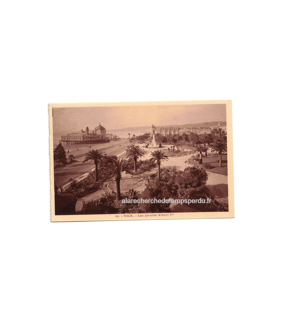Carte postale de Nice, les jardins Albert Ier N°16 - Collection "Nice" des Editions A la Riviera, 20 vues artistiques, - Faisait partie d'un carnet de cartes postales avec dentelures pour être détachées et expédiées.