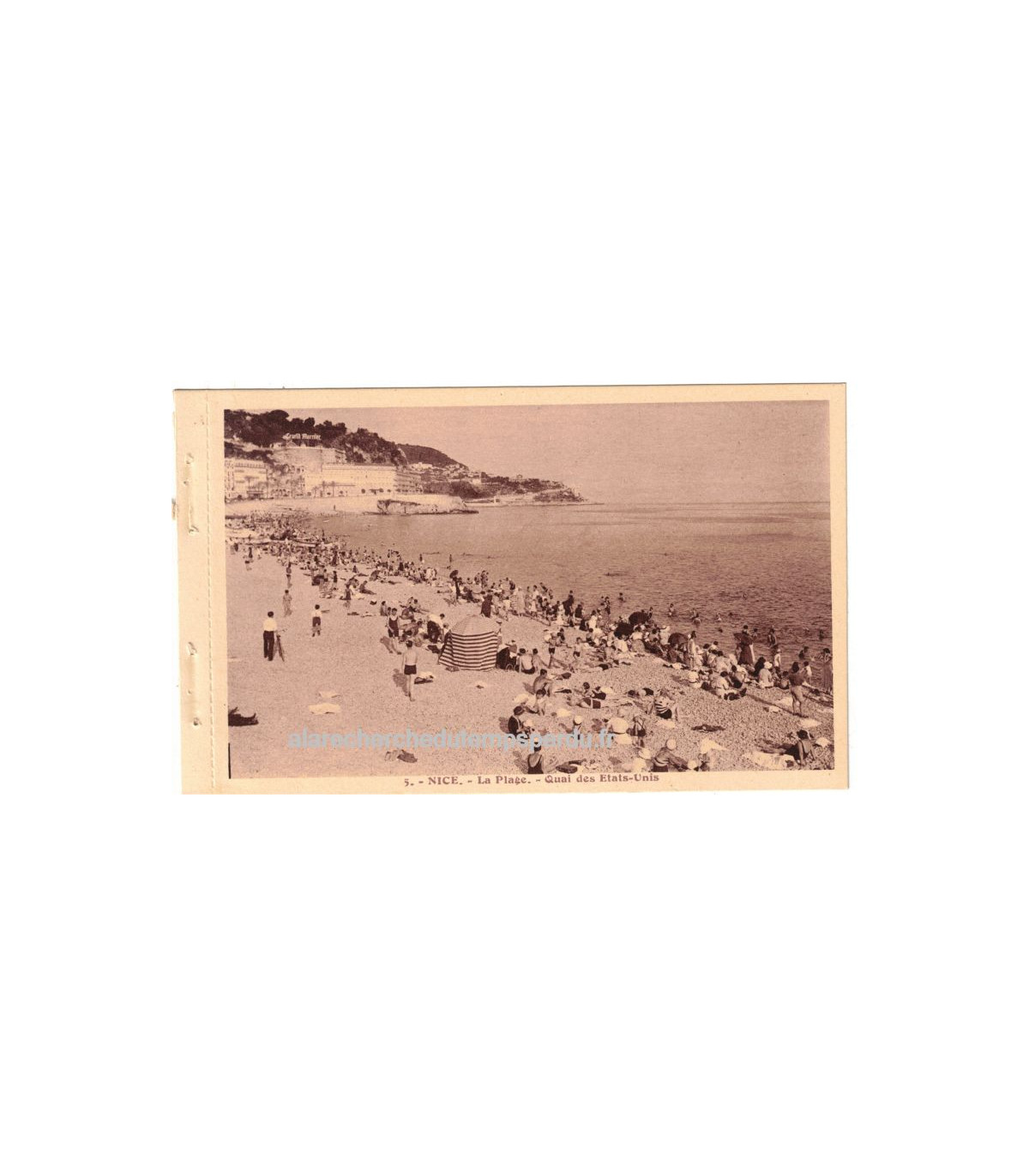 Carte postale de Nice, la plage, Quai des Etats-Unis N°5 - Collection "Nice" des Editions A la Riviera, 20 vues artistiques, - Faisait partie d'un carnet de cartes postales avec dentelures pour être détachées et expédiées.