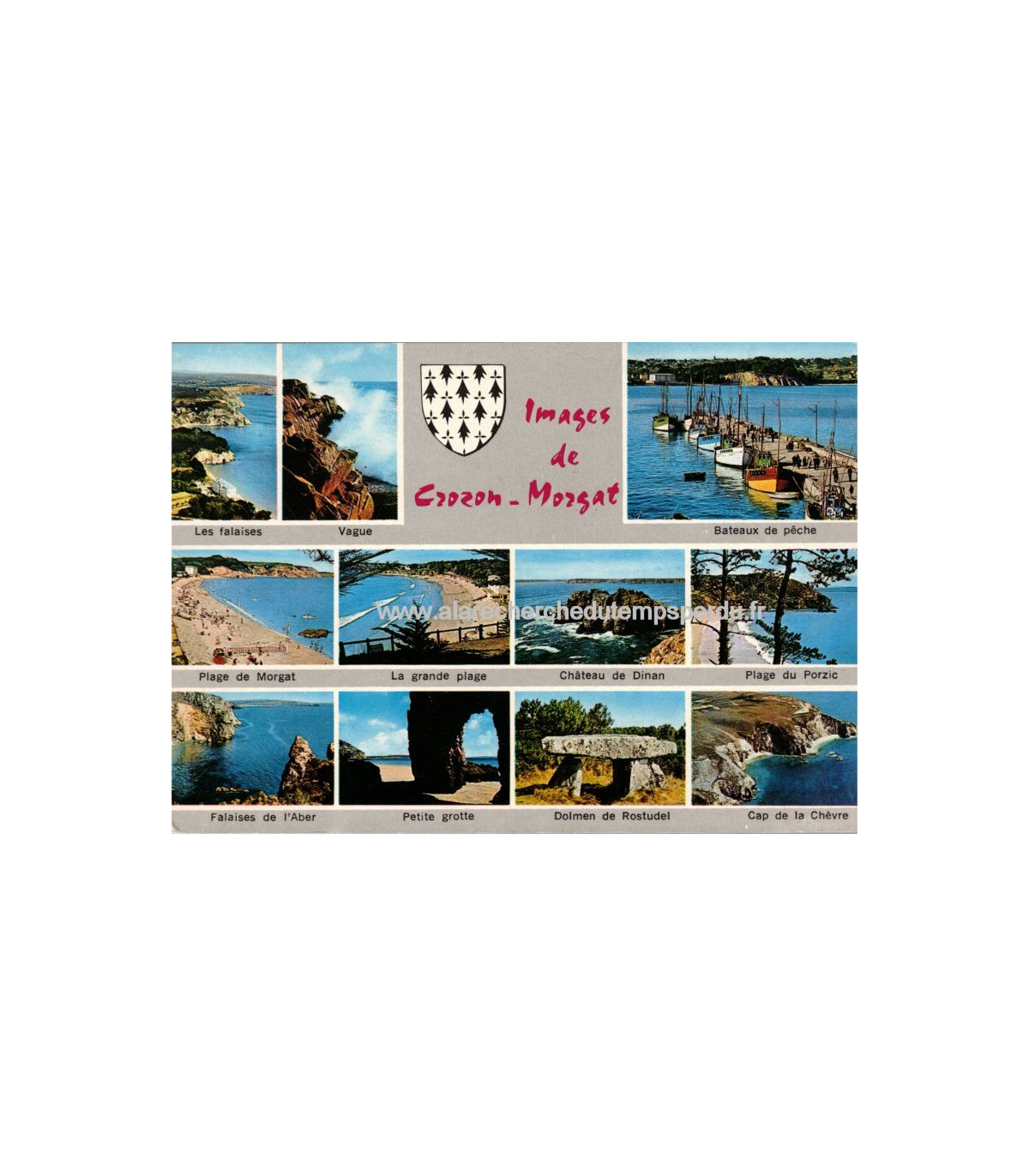 Carte multi-vues : les falaises, bateaux de pêche, plage de Morgat, la grande plage, château de Dinan, plage du Porzic, falaises de l'Aber, petite grotte, dolmen de Rostudel, Cap de la Chèvre -