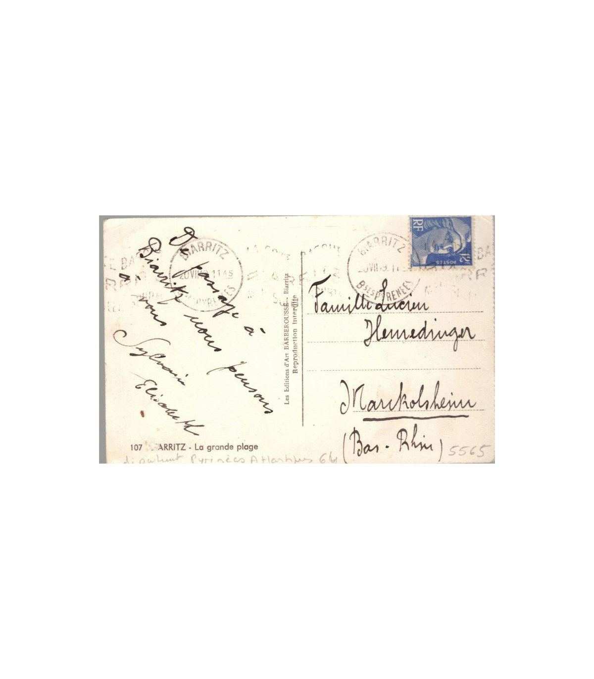 Description : carte postale ayant circulée, oblitérée, avec timbre buste de Marianne 12f bleu. Expédiée à Marckolsheim 67. Petite usure au verso sur le mot Biarritz en bas de carte.