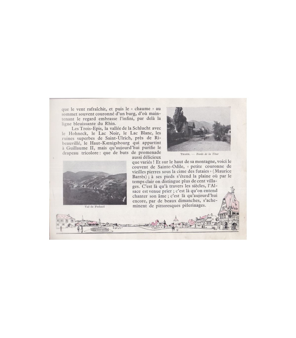 Promenade en Alsace du Haut-Rhin et du Bas-Rhin, brochure illustrée par Félix Jobbé Duval - Avec un dessin en frise sur chaque page de Jobbé Duval, des illustrations pleine-page en couleurs de la Place Kléber à Strasbourg, Sainte-Odile, Haut-Koenigsbourg, Saint-Ulrich. Photographies de Lumière et Jougla : Colmar Maison Pfister - Strasbourg Petite France, Metz Cathédrale - Sélestat Eglise St-Georges, la Schucht, Fischboedlé, Mulhouse vue générale, le Linge le Lac Noir, Kayserberg, Val de Freland, Thann bords de la Thur, lac de Hanau. Texte de André Lichtenberger.