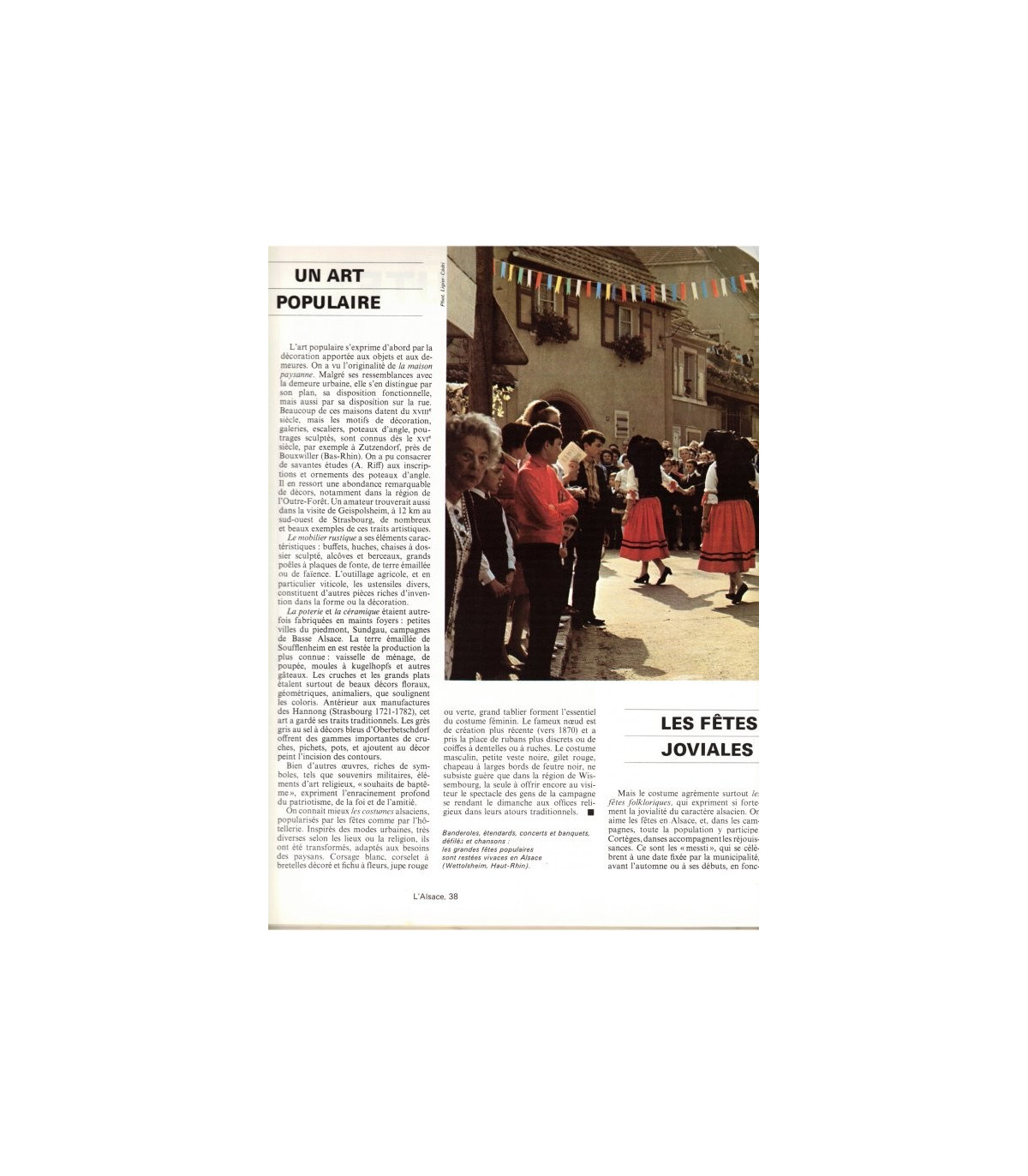 II. L'avenant visage de l'Alsace rurale : dans le fossé du Rhin : la plaine aux cinq terroirs, vivants villages, les bastions agricoles, aux vins d'Alsace - Le rempart des belvédères : les vallées d'où la vie s'en va - riche nature aux bords de l'Alsace - Toute la vitalité d'un peuple, un art populaire, les fêtes joviales -