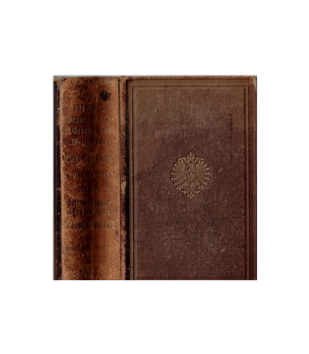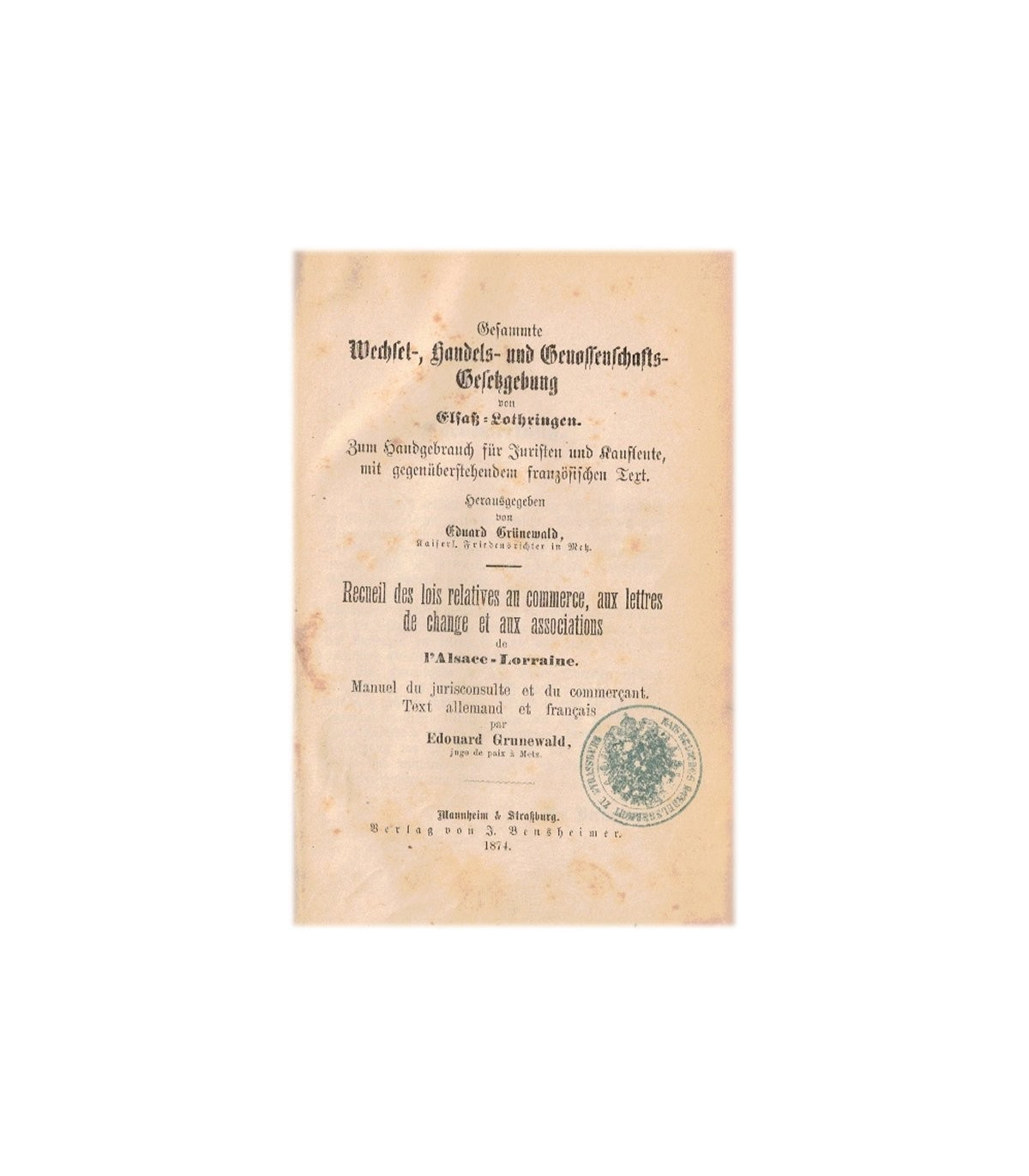 Recueil des lois relatives au commerce, aux lettres de change, et aux associations de l'Alsace-Lorraine, Edouard Grunewald, juge de paix à Metz - Manuel du jurisconsulte et du commerçant - Texte allemand et français - - Gesammte Wechsel-, Handels- und Genossenschafts-Gesetzgebung von Elsaß-Lothringen, Edouard Grunewald : zum Handgebrauch für Juristen und Kaufleute, mit gegenüberstehendem französischen Text - Loi concernant l'introduction du code de commerce allemand en Alsace-Lorraine - - Faillites, banqueroutes, Réhabilitations - l'organisation des Tribunaux de commerce - forme de procédure devant les Cours impériales - Chambres de Commerce et Chambres consultatives des Arts et Manufactures - Prud'hommes - Marques de fabrique - Patentes - Ateliers et manufactures insalubres - Nomenclature des Etablissements insalubres, dangereux ou incommodes - Loi du 5 juin 1850 relative aux effets de commerce - Sociétés d'assurances - Des Bourses de Commerce, agents de change et courtiers - Ventes publiques - Règlement général sur la lettre de change - des sociétés de commerce -- Des opérations commerciales - Du commerce maritime - loi concernant la position juridique privée des associations industrielles et commerciales - loi allemande sur les Associations - Verlag von J. Bensheimer, Mannheim &Strassburg, 1874. #Concordat, #lois Concordat, #droit local, #droit local alsacien, #code du commerce, #législation allemande, #Alsace Lorraine, #législation Alsace Lorraine, #prince de Bismarck, #lois germaniques, #droit commercial, #alsatiques, #Elsass Lothringen, #livre rare,