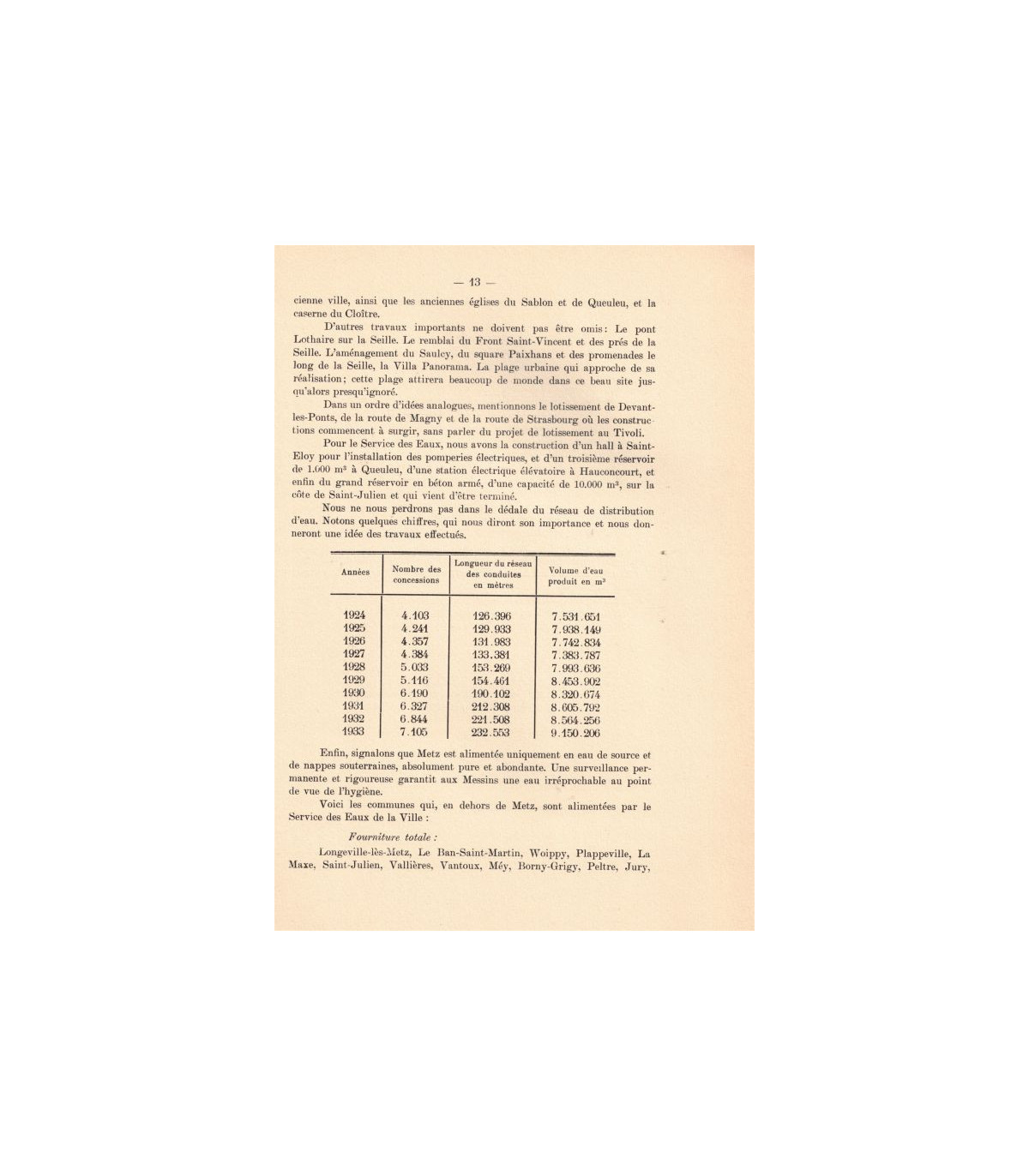 - Annexes : urbanisme - plan d'aménagement - travaux réalisés - population - achat d'immeubles - vente de places à bâtir - loyers - bains et lavoirs municipaux - Ecoles élémentaires et maternelles - hygiène, mortalité infantile, clinique dentaire - sapeurs-pompiers - chômage - Hospices civils - Caisse d'Epargne - situation financière de la ville de Metz - budget ordinaire - remembrement -