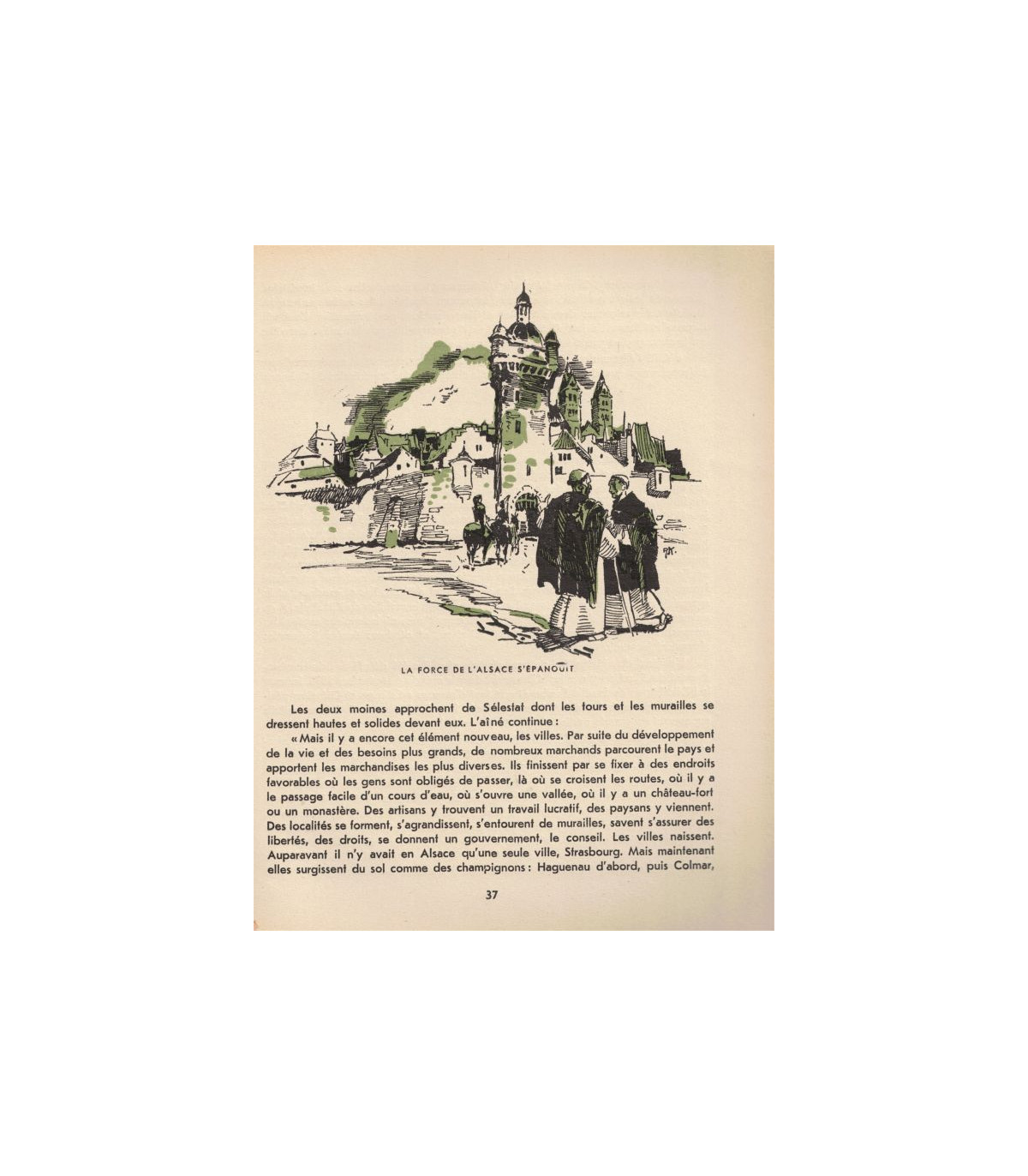 Histoire d'Alsace pour les jeunes, par Lucien Sittler, archiviste de la Ville de Colmar - Très belles illustrations de René Kudler - Avec des planches hors-texte : l'Alsace préhistorique, Sainte Odile, Sacrifice de Roesselmann pour la liberté de Colmar, la Marseillaise. 1. Les débuts : un très long voyage - légende souriante - le mur gigantesque - deux hommes face à face - le pays ensoleillé - 2. la jeunesse de l'Alsace : l'an 500 vient de passer - une couronne et une douce main de femme - la croix se dresse - couleurs claires, couleurs sombres - un serment significatif - trois impératrices alsaciennes - 3. l'épanouissement de la vie alsacienne : après l'an 1000 - une grande figure rayonnante - les femmes de Rouffach - comment naquit Haguenau - que d'yeux sont tournés vers l'Alsace du XIIIe siècle - un grand livre s'ouvre devant nous - coups de lance, coups d'épée - le citadin tenace et fort - les bienfaits de l'Eglise - comme la Cathédrale de Strasbourg rayonne au loin - les Armagnacs pris de peur - le tyran Pierre de Haguenau - la belle Vierge - 4. L'Alsace au début des Temps Modernes : la grande scission - le paysan se lève - un nouveau savoir - grandeur de Strasbourg - beauté et richesse - la catastrophe - 5. L'Alsace française : l'Alsace revient à la France - la reconstruction - Turenne à Turckheim - la défense du Haut-Barr - Madame d'Oberkirch parle - un exemple admirable - le pays de la Marseillaise - la guillotine - pages de gloire - un garçon passe à travers l'Alsace - un grand deuil - montagnes sanglantes - l'accueil triomphal - épopée héroïque. éditions Alsatia 1947. #histoire Alsace, #manuels d'histoire, #contes populaires, #littérature jeunesse, #éducation jeunesse, #beaux livres d'images, #livres pour enfants, #beaux livres pour enfants, #illustrateurs alsaciens, #René Kudler, #histoire de France en images, #alsatiques, #alsaciens, #éditions Alsatia.