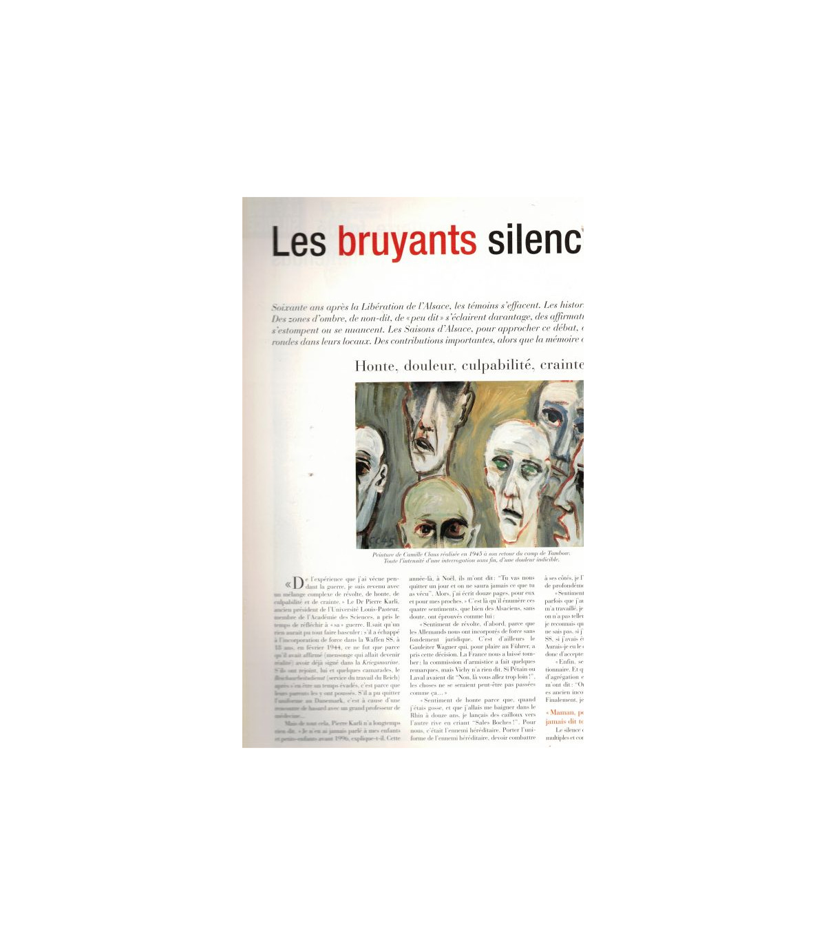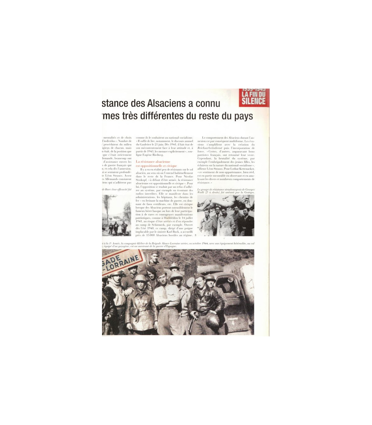 Dossier 1939-1945, la fin du silence : le silence et son prix ; Marc Ferro, les Alsaciens ne sont pas des victimes de l'Histoire ; six leçons d'histoire ; les bruyants silences de l'après-guerre ; les blessures de la mémoire ne cicatrisent pas ; le lent réveil de la parole ; la leçon des Deux Mathilde ; paroles de collégiens ; le Mémorial d'Alsace-Lorraine ouvre à Schirmeck -