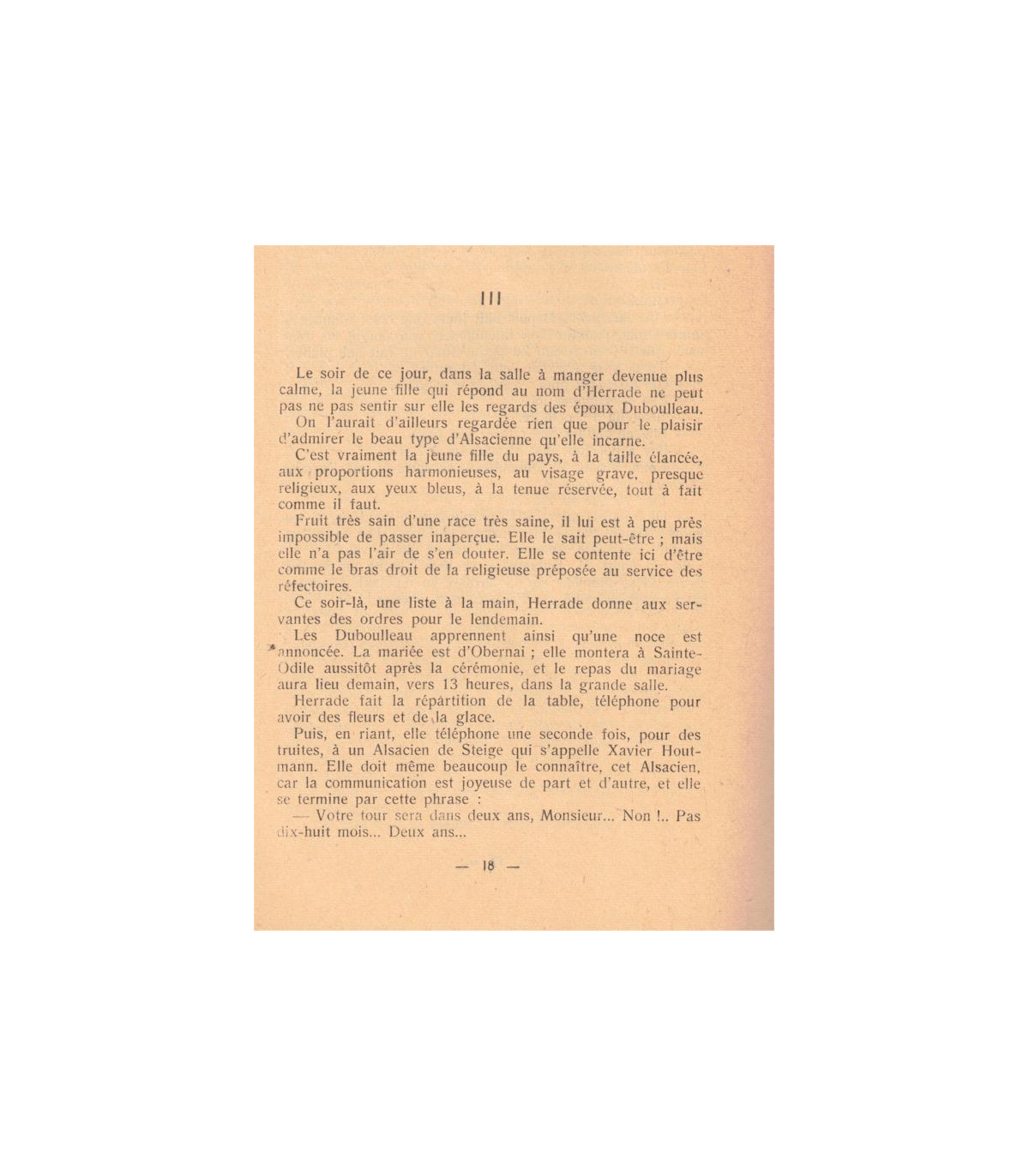 "La salle à manger du couvent de la Montagne Sainte-Odile par un beau matin d'août. Vaste, claire et gaie, elle est pleine de monde, car les douze coups de midi viennent de sonner dans la grande cour de grès rose. Atmosphère alsacienne, c'est-à-dire familiale.