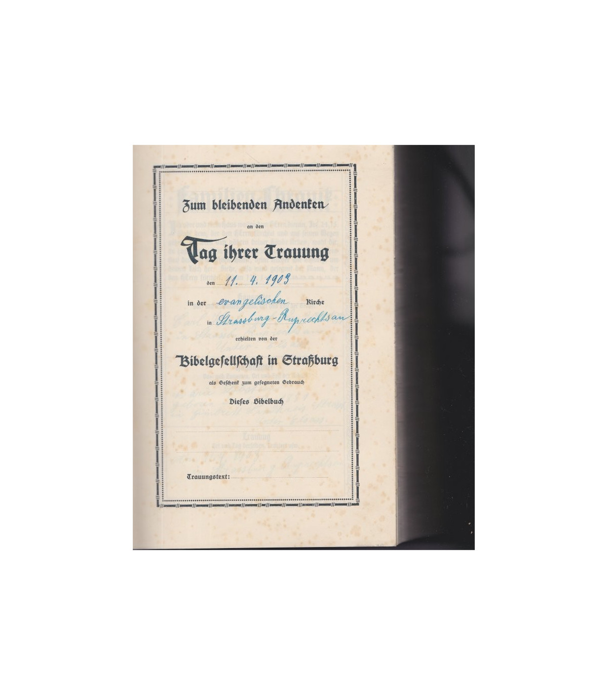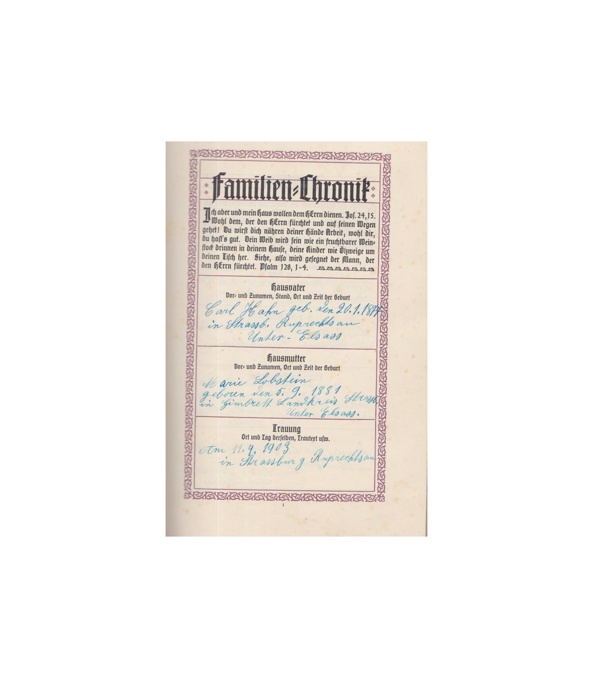 Die Bibel ober di ganze Heilige Schrift des Alten und Neuen Testaments nach der deutschen Übersetzung D. Martin Luthers. - La Bible ou l'histoire sainte de l'Ancien et Nouveau Testament d'après la traduction allemande de Martin Luther. Avec six pages aux cadres pré-remplis complétés par l'écriture manuscrite d'une famille alsacienne en 1903, de Strasbourg Robersau, généalogie des familles HAHN, LOBSTEIN MÜNCH, FISCHBACH, SOMMER, ASAEL, RIEBEL de la Robertsau, Gimbrett, Mittelhausbergen, Hohfrankenheim. Neu durchgesehen nach dem vom Deutschen Evangelischen Kirchenausschutz genehmigen Text - Zum bleibenden Andenken an den Tag iher Trauung den 11.4.1903 in der evangelischen Kirche in Strassburg Ruprechtsau, erhielten von der Bibelgesellschaft in Strasburg als Geschenk zum gesegneten Gebrauch dieses Bebelbuch.