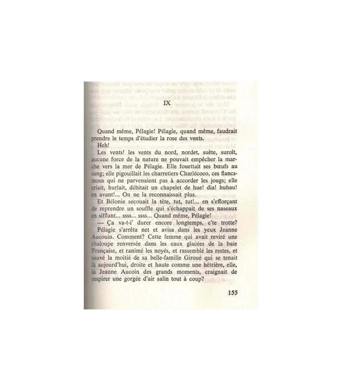 Parmi ces exilés, il y avait une certaine Pélagie Bourg dite Le Blanc, qui n'avait pas oublié sa Grand'Prée, là-haut sur la baie. Alors, après des années de misère, la voilà qui s'achète une charrette et une paire de bœufs pour y entasser les siens, Charlécoco les Bessons, Madeleine sa fille, Célina la boiteuse, Catoune la sauvageonne, et le vieux Bélonie, le centenaire, mémoire de la tribu.