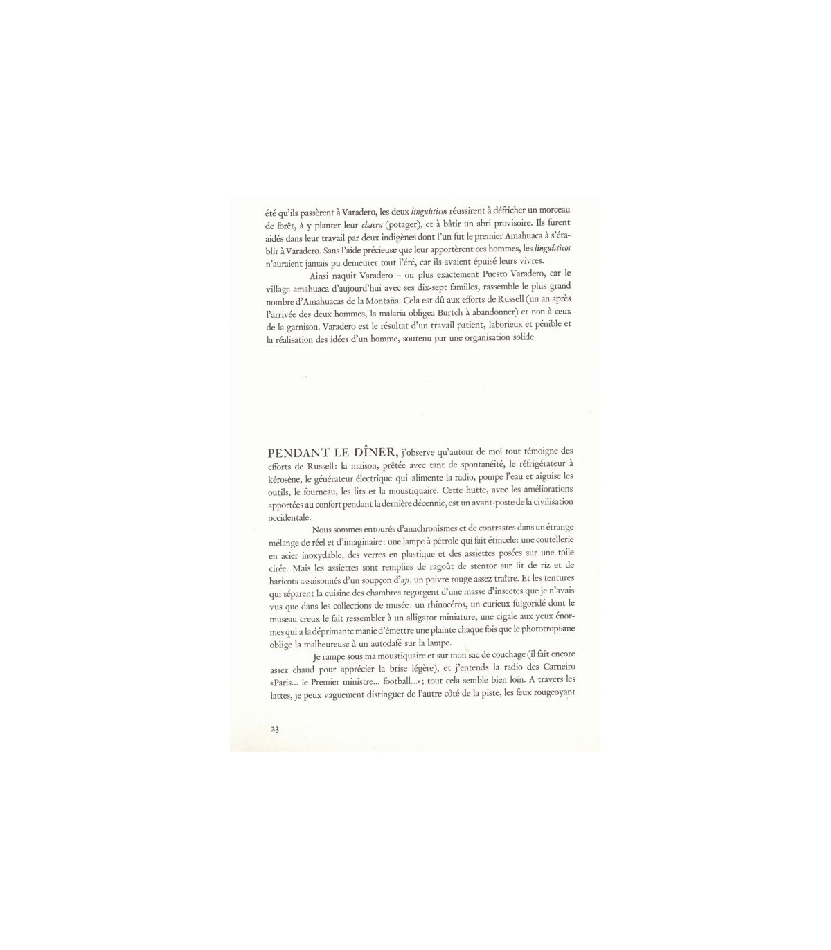 En 1961, Cornell Capa et Matthew Huxley atteignirent Puerto Varadero, une communauté de 17 familles situées dans la jungle, à la frontière du Pérou et du Brésil. "Il y a vingt ans, Varadero n'existait pas, et aujourd'hui encore on ne la trouve que sur les cartes les plus récentes et les plus exactes. Malgré sa petitesse, c'est la plus importante communauté d'indiens amahuacas existant dans la jungle tropicale du Pérou et les Amahuacas qui, linguistiquement, se rattachent aux Panoens, ont eu moins de contacts avec les Blancs que tout autre tribu de la Montana (ainsi que l'on nomme la partie péruvienne de la forêt amazonienne). De mémoire de tribu, on n'a pas vu à Varadero plus d'une trentaine de Blancs.