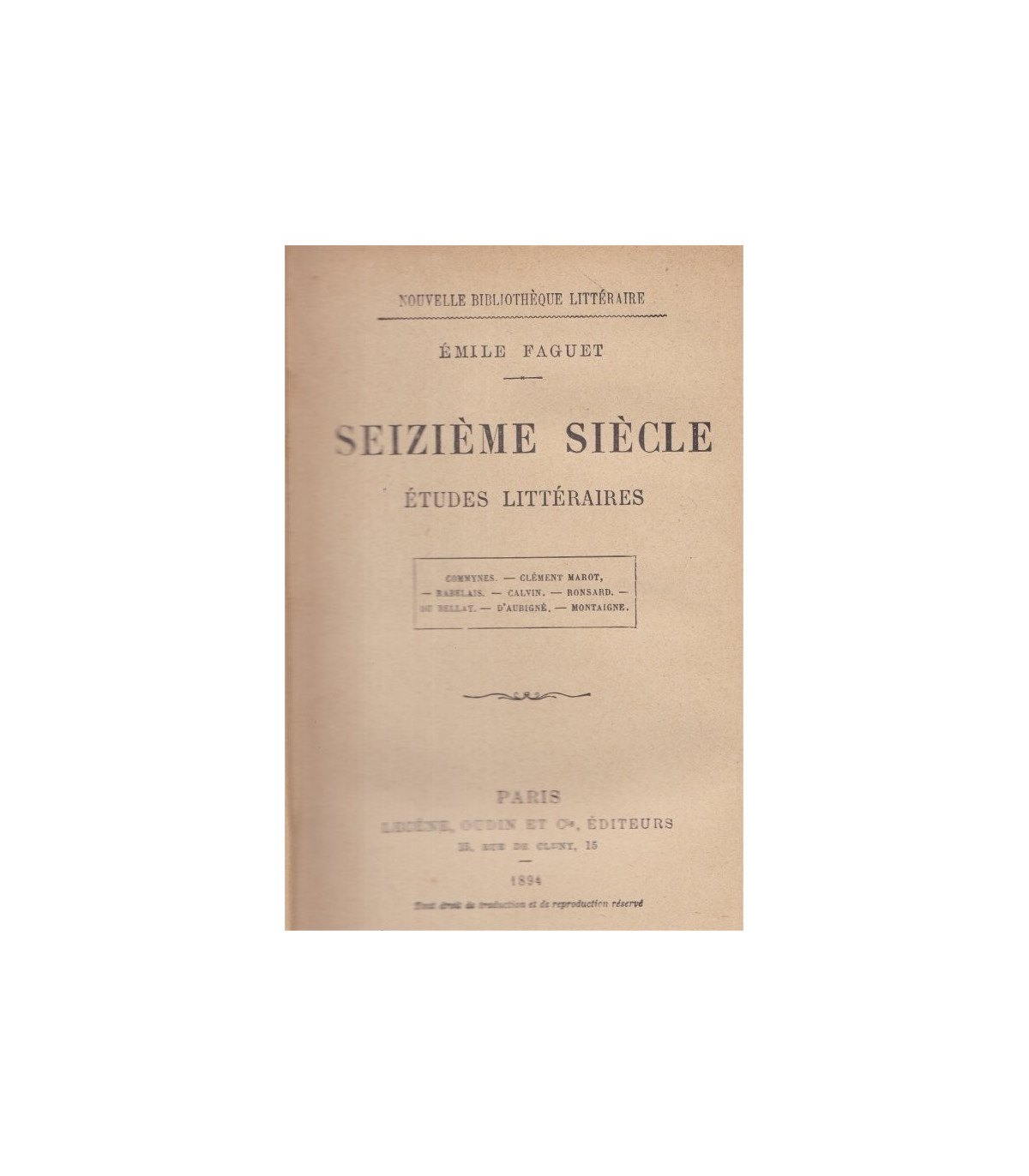 Seizième siècle, études littéraires, par Emile Faguet - Nouvelle bibliothèque littéraire - Commynes : sa vie, sa tournure d'esprit, ses idées politiques, Commynes moraliste, l'écrivain - Clément Marot : sa vie, caractère, tournure d'esprit, idées littéraires. Marot poète courtisant, poète familier. Marot poète polémiste, poète religieux, poète versificateur. Son style et ses rythmes - Rabelais : sa vie et son caractère, son dessein, son art, ses idées. Rabelais et les mœurs de son temps. Rabelais écrivain - Calvin : sa vie, son dessein, sa doctrine. Calvin écrivain - Ronsard : sa vie, son caractère. Doctrine littéraire de Ronsard et de la Pléiade. Les quatre manières de Ronsard - Ronsard imitateur. Ronsard épique, poète-orateur, élégiaque, lyrique. Ronsard écrivain. La rythmique de Ronsard - Joachim du Bellay : sa vie et son caractère. Du Bellay pétrarquiste. Du Bellay poète personnel, le satirique. L'artiste, le rustique, l'élégiaque - D'Aubigné : sa vie, son caractère. D'Aubigné conteur et polémiste. D'Aubigné poète élégiaque. Les Tragiques - Montaigne : sa vie et son caractère. Dessein de Montaigne à connaître l'homme. Le scepticisme de Montaigne. Le dogmatisme de Montaigne. L'homme de Renaissance. Montaigne sociologue. Montaigne peintre de son temps. Montaigne écrivain.