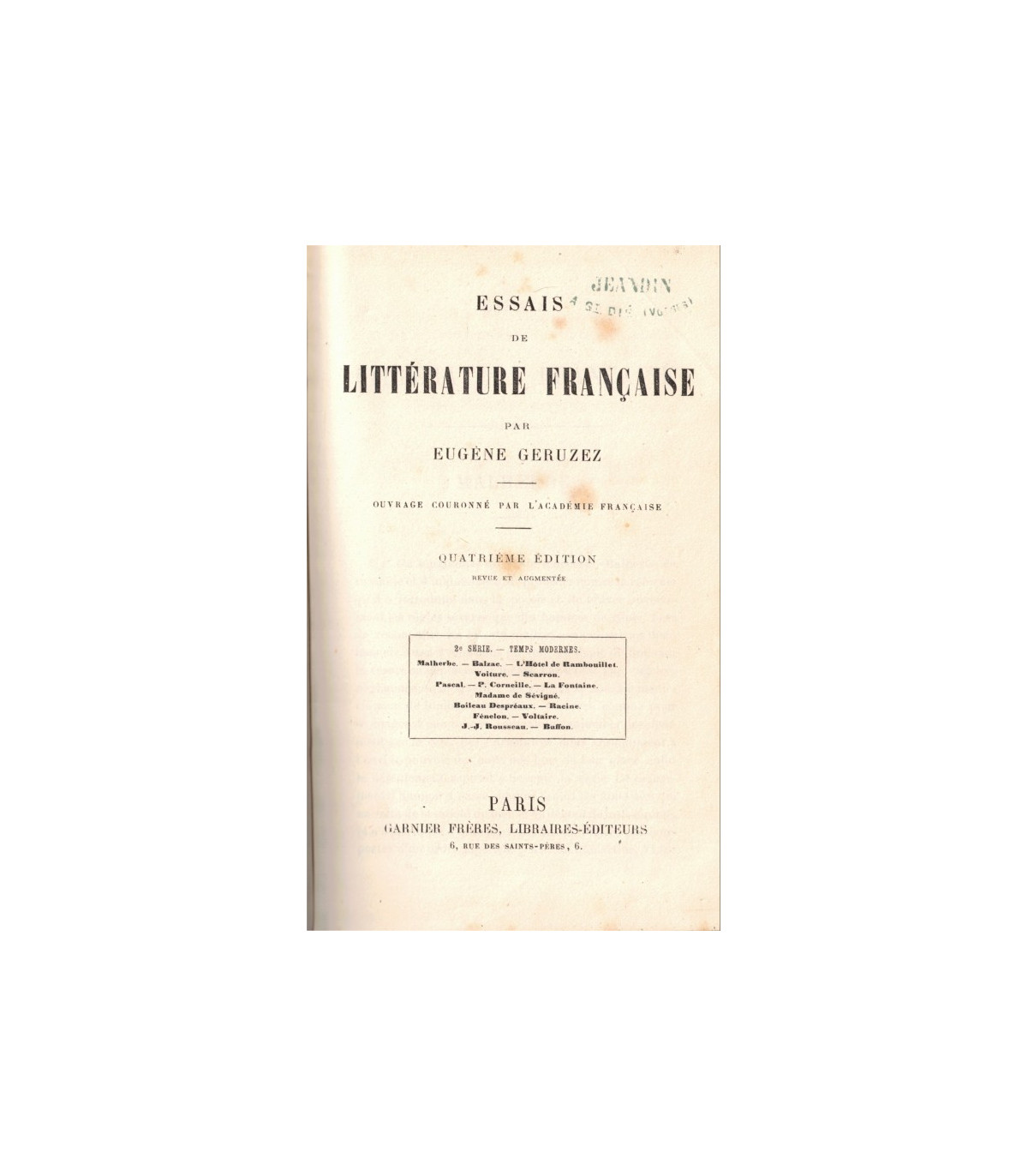 Essais de littérature française, Temps modernes, par Eugène Geruzez - Ouvrage couronné par l'Académie Française - Deuxième série - Malherbe - Balzac - L'Hôtel de Rambouillet - Voiture - Scarron - Pascal - Corneille - La Fontaine - Madame de Sévigné - Boileau Despréaux - Racine - Fénelon - Voltaire - Jean-Jacques Rousseau - Buffon. Quatrième édition revue et augmentée - éditions Garnier Frères, Paris. #littérature XVIIIe siècle, #littérature XIXe siècle, #biographies écrivains, #Malherbe, #Balzac, #Voiture, #Scarron, #Pascal, #Corneille - La Fontaine, #Madame de Sévigné, #Boileau Despréaux, #Racine, #Fénelon, #Voltaire, #Jean-Jacques Rousseau, #Buffon