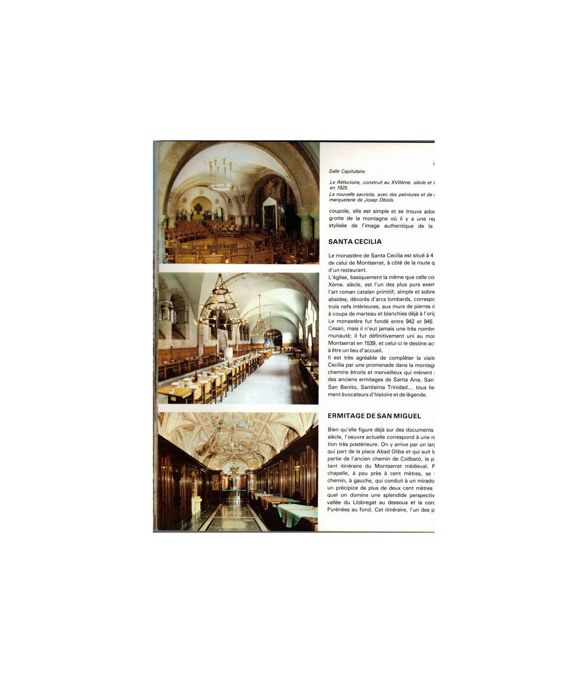 naissance du monastère - un paysage de fantaisie - la Morenata - l'Escolania - le sanctuaire - la crypte - le choeur supérieur - le Via Crucis - la Santa Cueva - Santa Cecilia - Ermitage de San Miguel - salle capitulaire - le réfectoire - le cloître roman - la bibliothèque - la communauté des moines - musées - aspect populaire de Montserrat - pèlerinage de Santa Maria - Virolai - éloge de Montserrat -