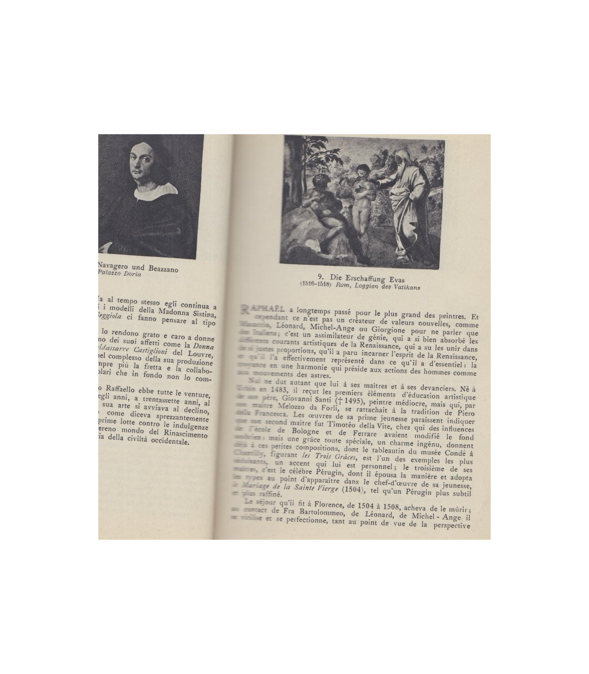 Raffael, Raphaël, par Jacques Mesnil - Collection Meister der Kunst de Braun & Co à Mulhouse. Avec 60 illustrations, dont 48 reproductions hors-texte. Livret de 12 cm X 16,5 cm publié lorsque l'Alsace était annexée par l'Allemagne. Le texte introductif est à la fois en français, allemand et italien. Les légendes des œuvres sont en allemand.