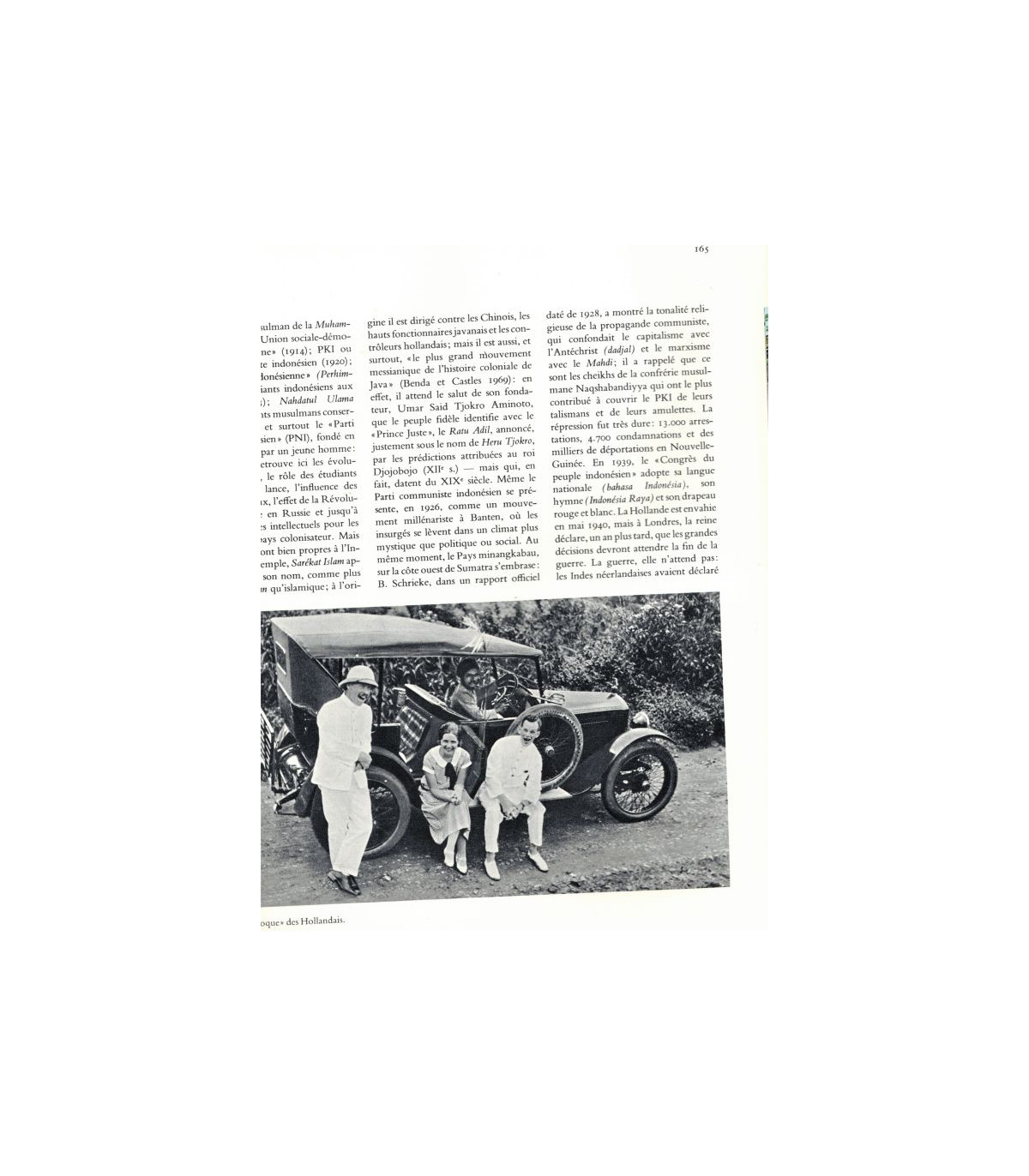 L'Indonésie, pour l'homme d'Europe, c'est le bout du monde, le diable vert, à vingt heures d'avion, à 45 jours de mer. Sait-il seulement que l'archipel - Nusantara - sème plus de treize mille îles sur deux millions de kilomètres carrés, entre la mer de Chine, l'océan indien et le Pacifique ? Que l'équateur le coupe en laissant six degrés de latitude au nord et onze au sud ? Qu'il s'étend sur deux mille kilomètres du nord au sud, et que la distance qui sépare la pointe de Sumatra du cœur de la Nouvelle-Guinée - soit cinq mille kilomètres - est aussi longue que celle de Paris à Dakar ? Qu'entre l'Indochine et l'Australie, l'Indonésie n'est autre que l'Insulinde (dont les îles de la Sonde) ou les anciennes Indes néerlandaises ? Qu'elle a vingt siècles d'histoire derrière elle, le plus vaste ensemble de reliefs bouddhiques du monde (Borobudur), l'une des cultures les plus raffinées ?