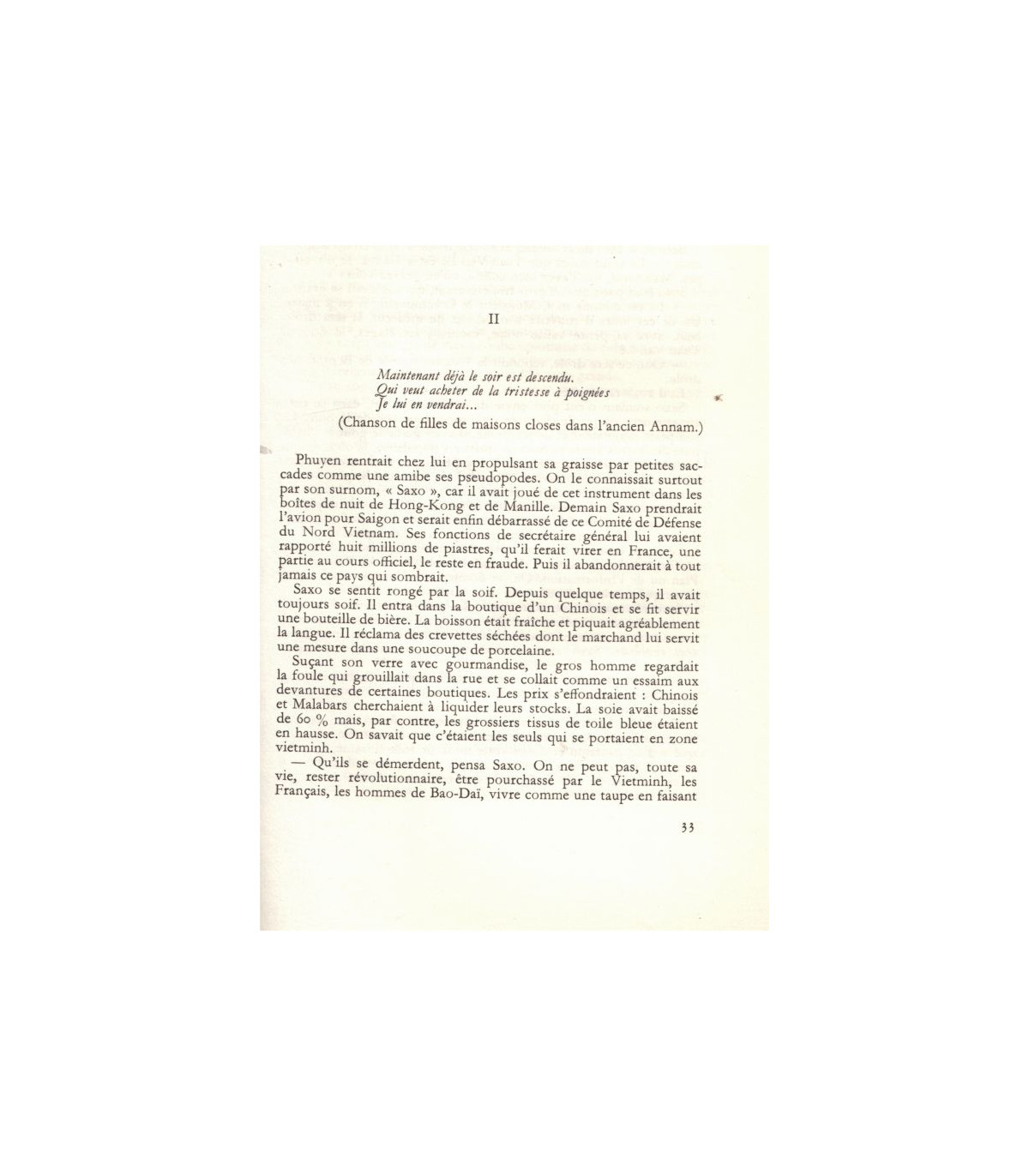 Jérôme avait quitté l'Indochine quelques mois plus tôt sachant que la partie était perdue. Il n'était pas mécontent de laisser à d'autres le soin de rédiger la notice nécrologique de cette guerre qui n'avait pas été seulement l'affrontement de deux idéologies mais avait permis à deux races très différentes de se découvrir des affinités profondes, et à quelques hommes dans les deux camps de vivre une belle aventure."