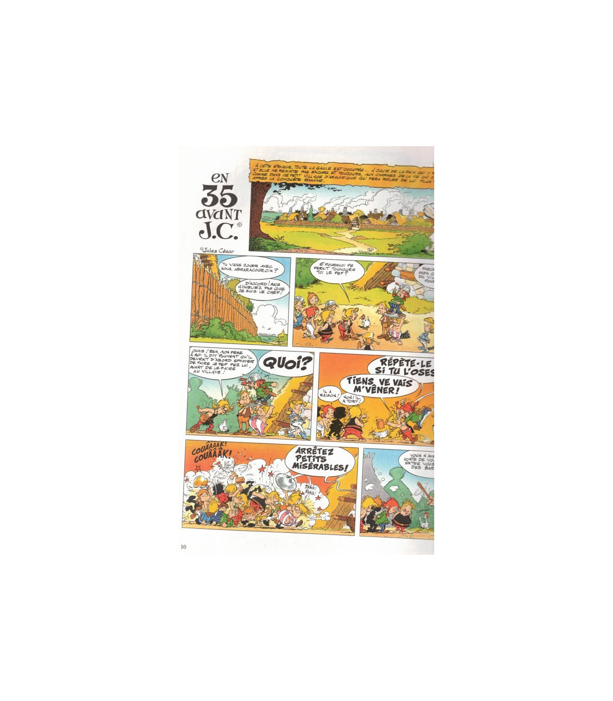 "Je me félicite, lectrices, lecteurs, de vous retrouver aussi nombreux... Certains d'entre vous désirent poser des questions... Je vous écoute. Oui ? - Vos prochaines aventures se passeront à l'étranger ? - Jouerez-vous un rôle important dans cet épisode ? - Merci. - Sera-t-il aussi sensationnel et amusant que les épisodes précédents ? Les Romains recevront-ils une bonne tripotée ? - C'est tout ? Bien.. Vous désirez savoir où se passera notre aventure, si j'y jouerai un rôle et si les Romains recevront une bonne raclée.. Il s'agit d'un recueil d'aventures différentes qui se passeront dans et autour de notre cher village. Moi, euh... J'y jouerai un rôle évidemment, et le Romains, ils recevront une bonne tripoté! Je crois que quelqu'un m'a demandé quand commenceront nos aventures. Elles commenceront dès que vous aurez pris la peine de tourner cette page! Je vous remercie pour votre attention!"
