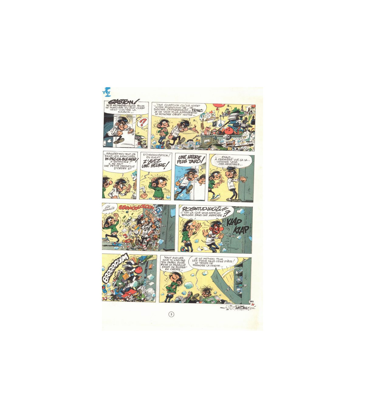 "Gaston ! Nos représentants pour le Nord-Est du Sud-Ouest vont visiter la maison... "?" "... Pas question qu'ils voient votre rogntudju de... de... disons capharnaüm... Donc: je ne veux plus aprercevoir le moindre objet inutile. Rangez-moi tout ça dans les armoires im-pec-ca-ble-ment! Z'entendez? Il me faut une petite merveille d'ordre et d'organisation! En avant, z'avez une heure!"