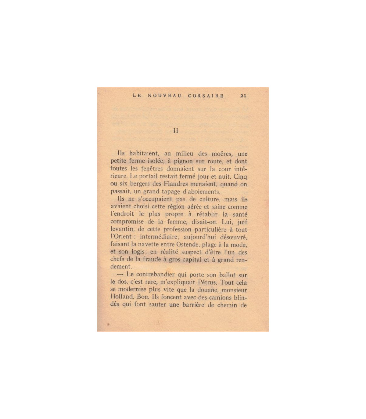 C'était l'époque de mes vacances. L'invasion annuelle des messieurs en flanelle et des dames en sweaters - filets de tennis, teams de polo et toutes les accentuations nasales - venait d'interrompre ls recherches que je poursuivais à la Panne sur l'utilisation des marées et comme je me trouve plus amoureux de la courbe noire d'un dauphin dans la courbure glauque d'une vague que de cinquante maillots, même collants, à mi-corps dans l'eau, ce village du bord de mer où je m'étais retiré provisoirement, cette auberge où la chère est bonne, la propreté flamande, me composaient ensemble, on ne peut mieux, le cadre d'une vie naturelle, fort paisible et bien équilibrée.