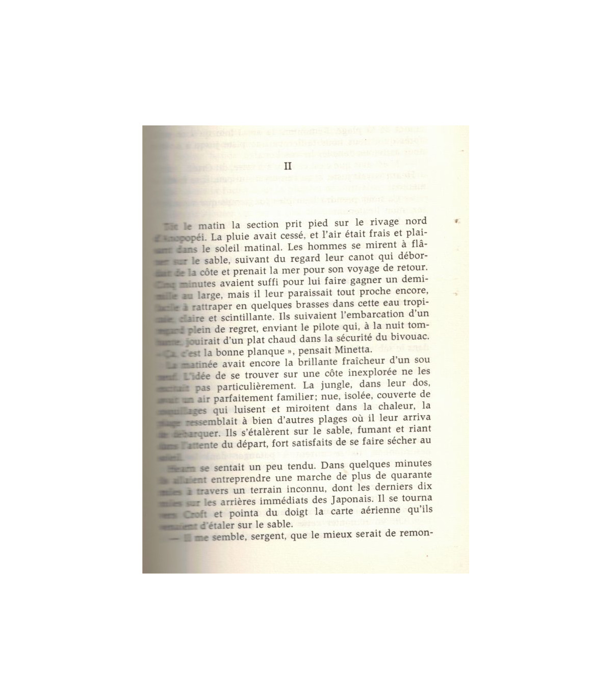 "Troisième partie - Reconnaissance partit en patrouille le lendemain après-midi. Ils s'embarquèrent plusieurs heures avant la nuit tombante, et peu de temps après, ayant contourné la péninsule, leur canot d'atterrissage piqua vers la pointe ouest d'Anopopéi. La houle était forte. Bien que naviguant à un mille au large, le canot roulait et tanguait, embarquant des paquets de mer par la rampe devant. C'était un petit canot identique à ceux dans lesquels ils avaient débarqué le jour de l'invasion, mal équipé pour faire le tour de la moitié de l'île. Entassés sur leurs couchettes et couverts de leurs toiles imperméables, les hommes se préparaient pour un voyage de chien.