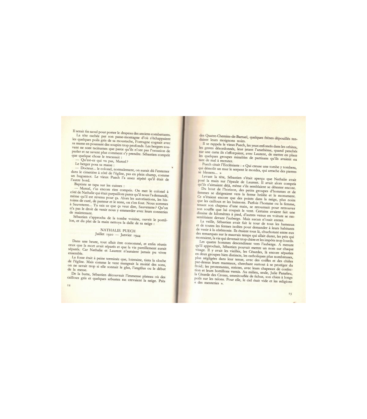 Sébastien Josc, 1er décembre 1965 - Des vents glacés galopaient sur le Causse, soulevant la neige poudreuse et dans le ciel poursuivaient en hurlant des nuages noirs. Sur une butte, à côté d'une tombe entourée d'une barrière de fer rouillée, quatre hommes creusaient une fosse à la barre à mine. La terre gelée éclatait en écailles dures sur lesquelles venait cogner le fer de la pelle. Parfois l'un des hommes jurait, un autre se raclait la gorge ou tapait du pied pour se réchauffer."
