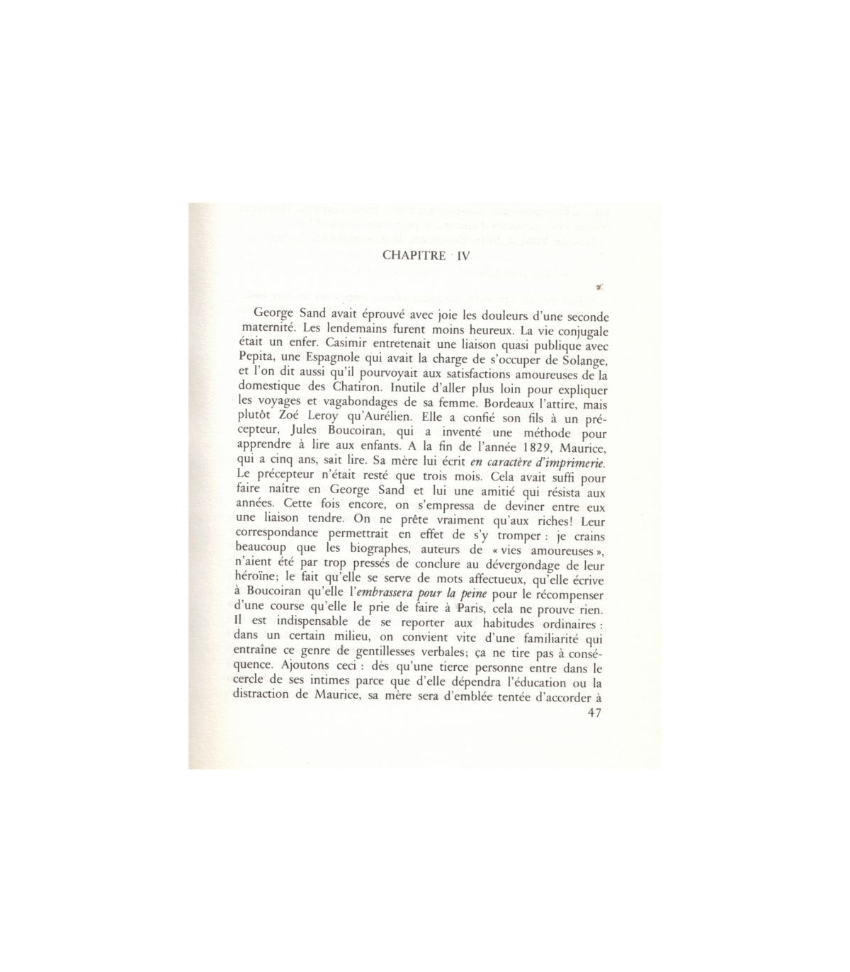 C'est qu'une affinité élective me portait vers elle sans doute, ne serait-ce que parce que nous sommes nés, elle et moi, à cent ans d'intervalle. J'y songeait ce jour-là. Et cela suffit à explique mon impression que Paris et Nohant formaient une seule et même partie pour George Sand.