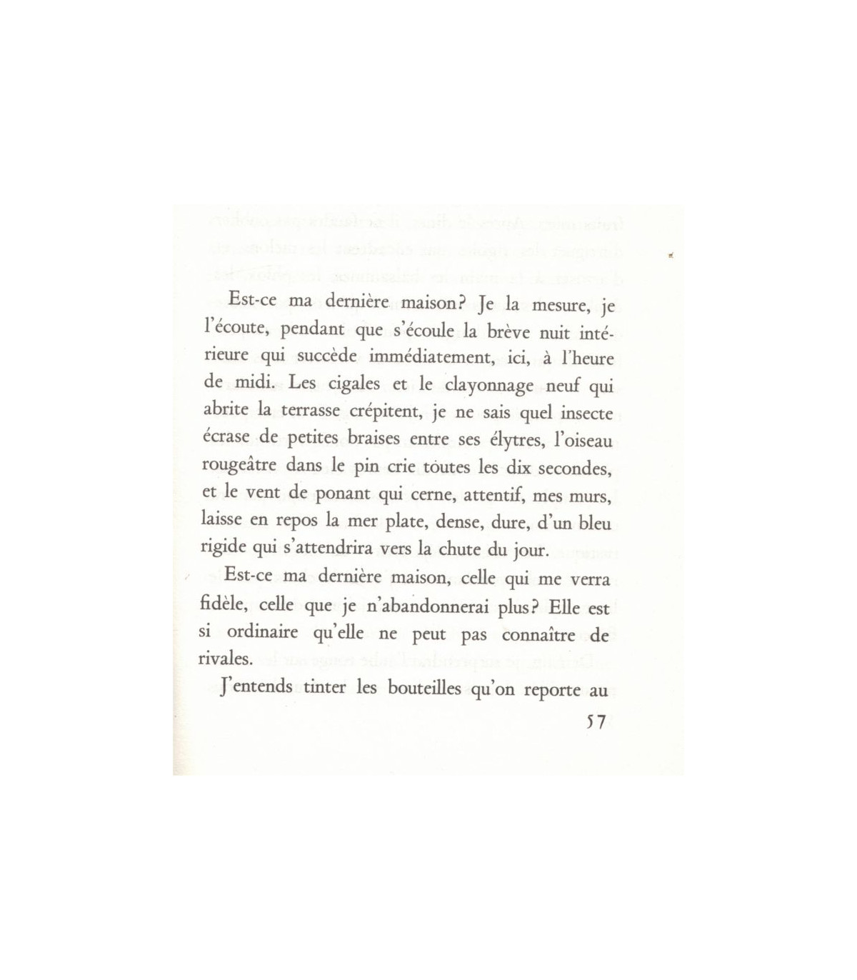 Au cours des heures où je me sens inférieure à tout ce qui m'entoure, menacée par ma propre médiocrité, effrayée de découvrir qu'un muscle perd sa vigueur, un désir sa force, une douleur la trempe affilée de son tranchant, je puis pourtant me redresser et me dire : "Je suis la fille de celle qui écrit cette lettre - cette lettre et tant d'autres, que j'ai gardées. Celle-ci, en dix lignes, m'enseigne qu'à soixante-seize ans elle projetait et entreprenait des voyages, mais que l'éclosion possible, l'attente d'une fleur tropicale suspendait tout et faisait silence même dans son cœur destiné à l'amour. Je suis la fille d'une femme qui, dans un petit pays honteux, avare et resserré, ouvrit sa maison villageoise aux chats errants, aux chemineaux et aux servantes enceintes. "