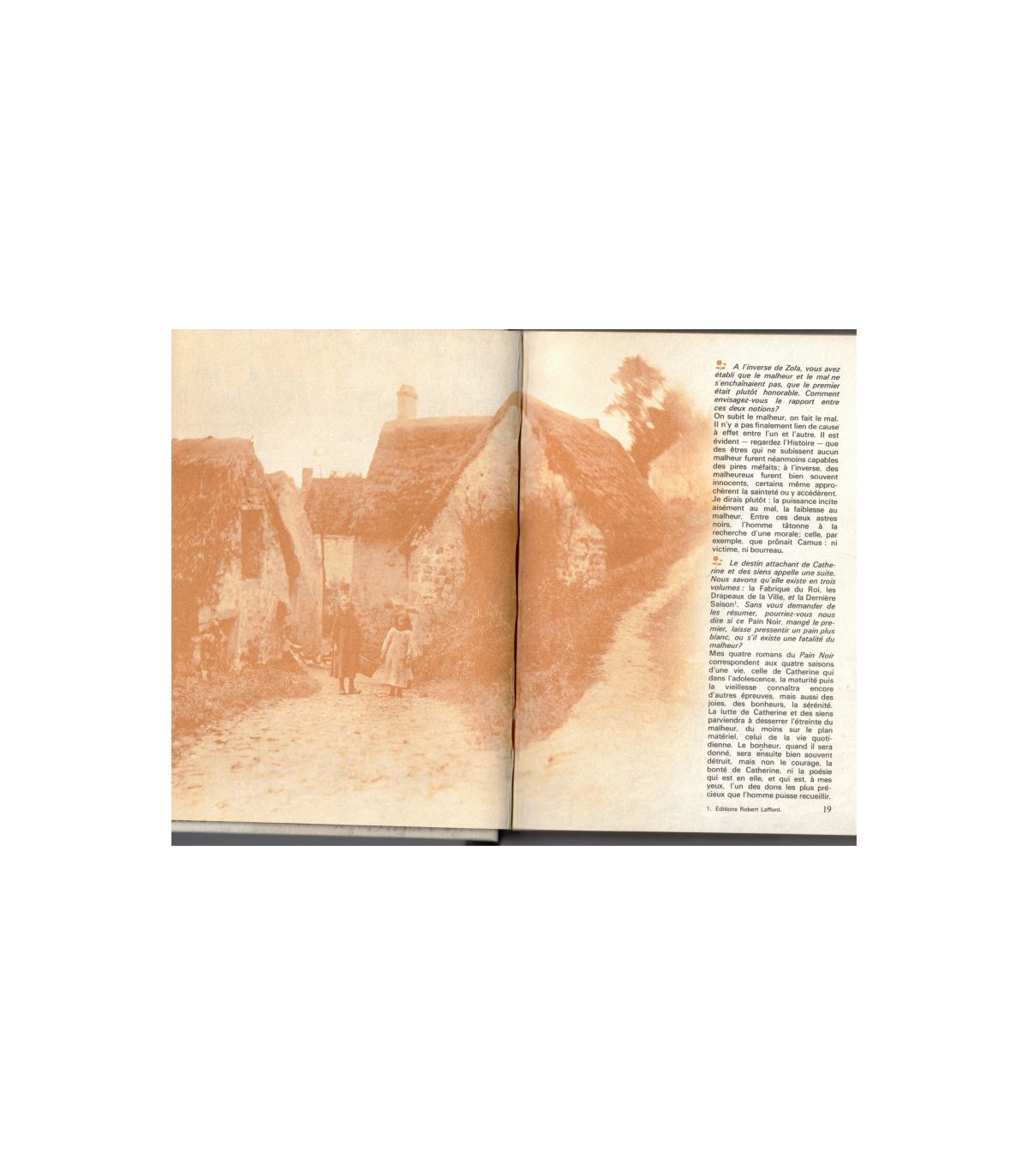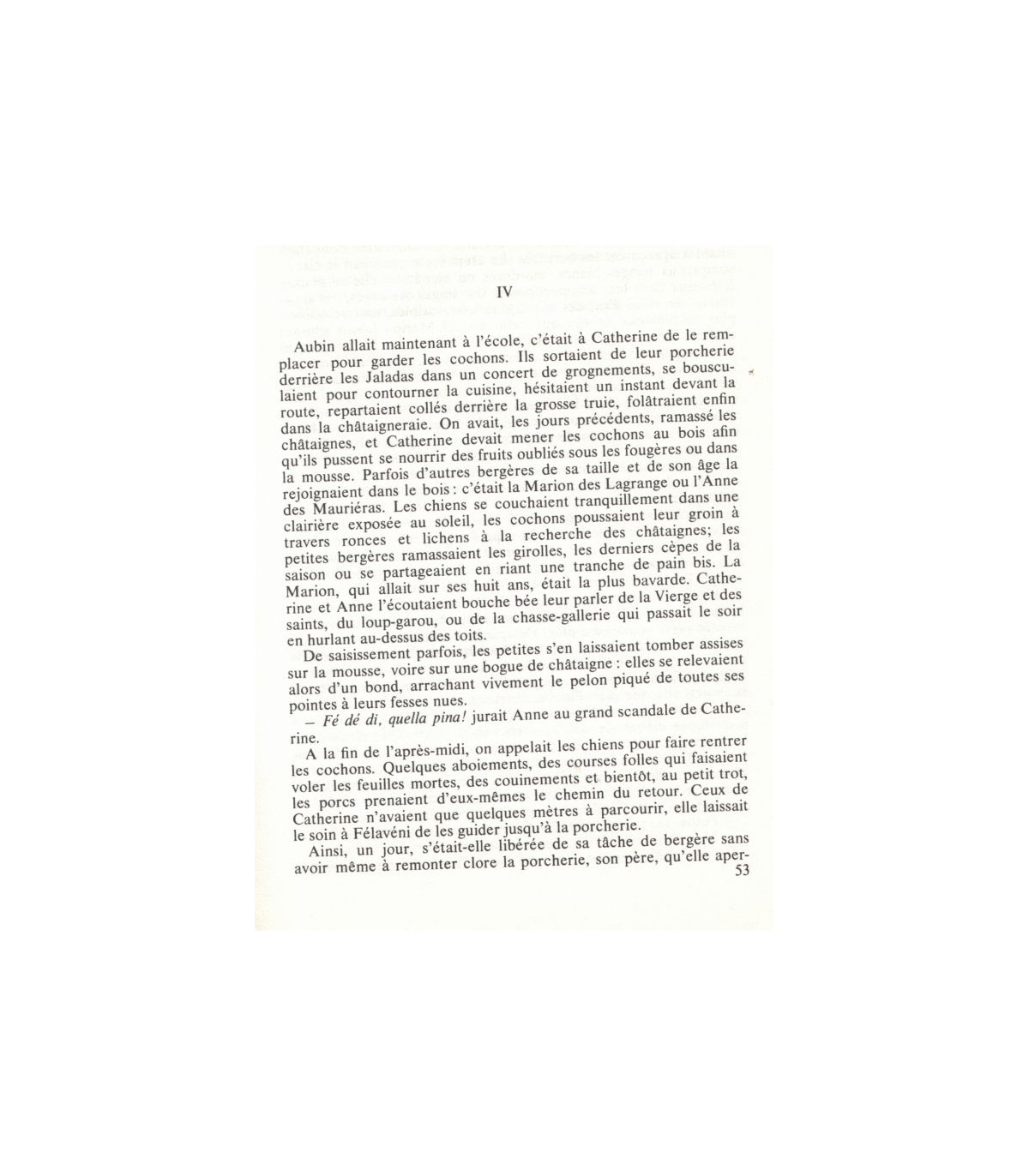 Les garçons, quel sommeil de plomb! Comment un sommeil pourrait-il être de plomb? "Je connais un marchand de plomb, dit la mère; il vient de Lyon, il ne faut lui dire ni oui ni non." Catherine a perdu hier soir à ce jeu. Son frère Aubin a gagné. Comme il dort.. Que va-t-elle faire aujourd'hui? Il y aura les cochons à garder, comme tous les jours; ça ne serait rien sans cette grosse truie qui lui fait peur. Il y aura, comme tous les jours, la vaisselle à essuyer, mais parfois, pendant ce travail monotone, la mère chante ou raconte des légendes qui donnent des frayeurs merveilleuses, et Mariette, la sœur aînée, n'arrête pas de bavarder: des histoires de jeunes filles, de promis, de bals, de mariages, de noces, de querelles: "Vous savez bien, Mère, et puis le fiancé qui les a surpris; la Marguerite rejoignait chaque soir un des postillons, le grand roux, dans la diligence, quand ils avaient dételé." Des histoires auxquelles on ne comprend pas grand'chose et qui ont l'air parfois d'énerver la mère, d'autres fois de la captiver au point de lui faire oublier la vaisselle; des histoires obscures et palpitantes.