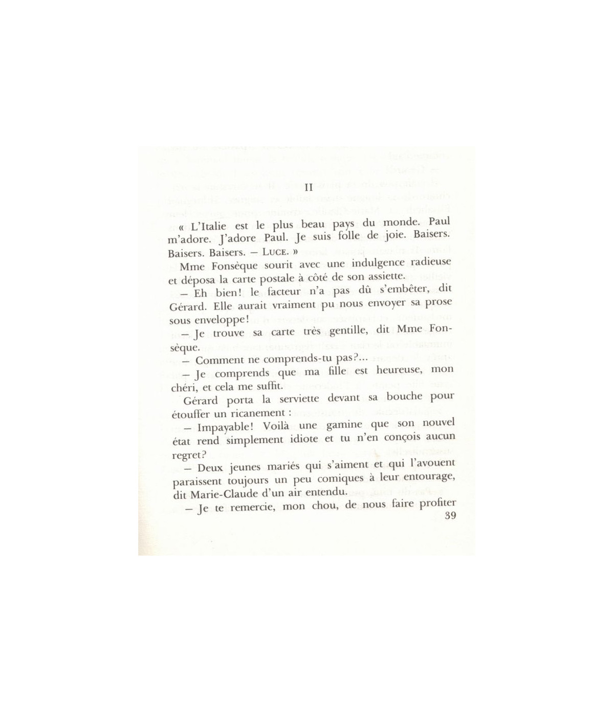 "Un coup de sonnette le fit tressaillir. Il regarda sa montre : une heure. Ni sa mère ni ses sœurs ne pouvaient être de retour. Des pas se rapprochaient dans le couloir sonore. Gérard Fonsèque se dressa hors de ses couvertures : - Qui est-ce ? - Lequesne. Je vous dérange ? (...)
