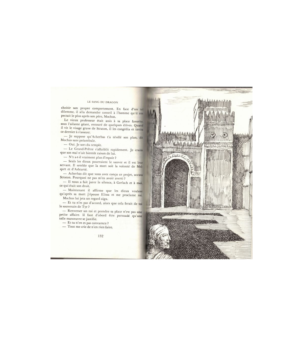 "L'homme élancé qui se dressait sur l'arrière-pont mouvant de la galère était aussi bronzé que l'équipage qui manœuvrait le grand vaisseau; Son pagne, en solide tissu de Tyr, ne différait pas de celui des esclaves appuyés sur leurs longues rames, afin de les maintenir hors de l'eau pendant que le navire noir avançait à la voile, fendant en direction de l'est les eaux bleues de la Méditerranée connue, depuis l'origine des temps, par ceux qui vivaient sur ses côtes ou la traversaient comme La Grande Mer. Et pourtant, tout observateur aurait aussitôt reconnu en lui le maître du navire et un meneur d'hommes.
