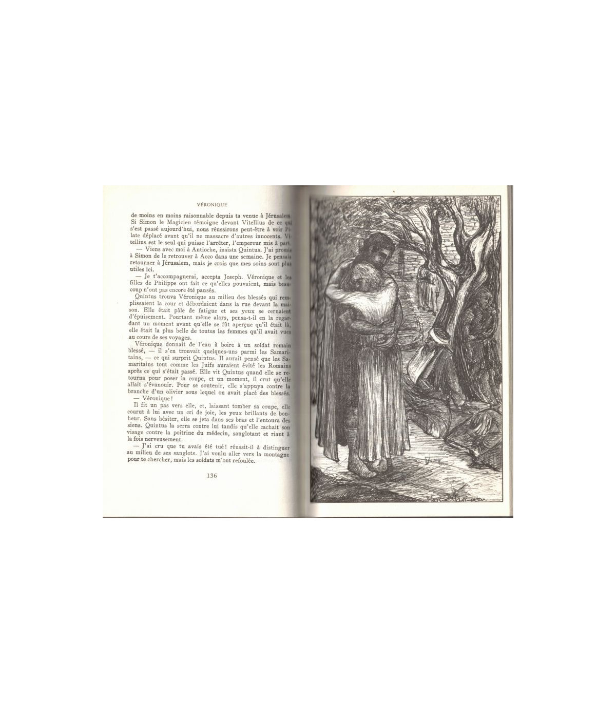 "Le soleil baissait à l'occident sur les collines lorsque Quintus Volusianus arrêta sa mule en un point où la route de Joppé contournait une crête dominant la ville de Jérusalem. Il faisait chaud car le printemps était déjà avancé. Au-dessous de lui sur la pente, les aubépines verdoyaient, mais en quelques endroits peut-être mieux arrosé ou mieux exposés aux rayons de soleil, déjà se montraient de petites fleurs qui ressemblaient à des goutes de sang.