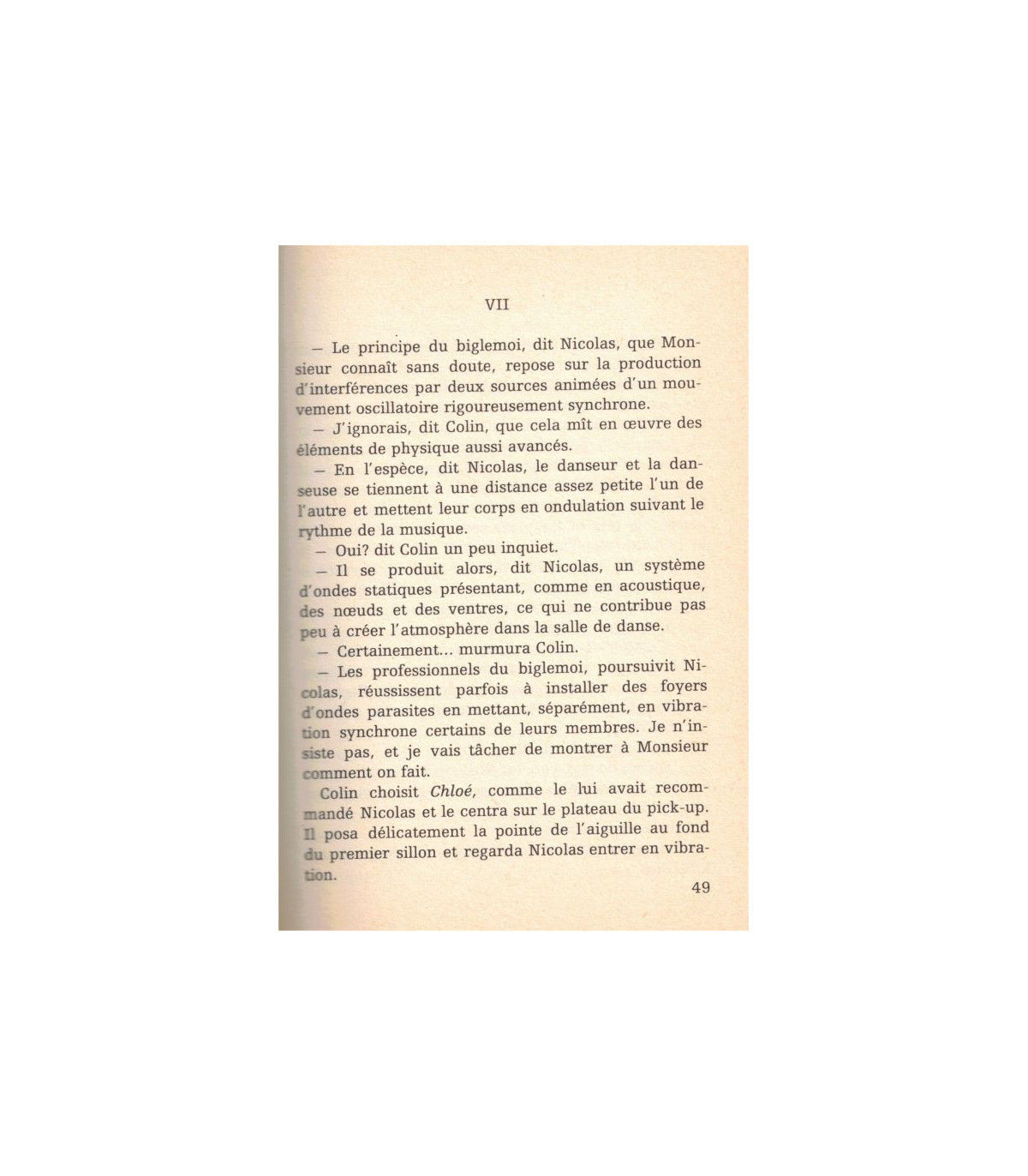 Colin terminait sa toilette. Il s'était enveloppé, au sortir du bain, d'une ample serviette de tissu bouclé dont seuls ses jambes et son torse dépassaient. Il prit à l'étagère de verre le vaporisateur et pulvérisa l'huile fluide et odorante sur ses cheveux clairs. Son peigne d'ambre divisa la masse soyeuse en longs filets orange pareils aux sillons que le gai laboureur trace à l'aide d'une fourchette dans de la confiture d'abricots. Colin reposa le peigne et, s'armant du coupe-ongles, tailla en biseau les coins de ses paupières mates, pour donner du mystère à son regard. Il devait recommencer souvent, car elles repoussaient vite. Il alluma la petite lampe du miroir grossissant et s'en approcha pour vérifier l'état de son épiderme. Quelques comédons saillaient aux alentours des ailes du nez. En se voyant si laids dans le miroir grossissant, ils rentrèrent prestement sous la peau et, satisfait, Colin éteignit la lampe. Il détacha la serviette qui lui ceignait les reins et passa l'un des coins entre ses doits de pied pour absorber les dernières traces d'humidité. Dans la glace, on pouvait voir à qui il ressemblait, le blond qui joue le rôle de Slim dans Hollywood Canteen. Sa tête était ronde, ses oreilles petites, son nez droit, son teint doré. Il souriait souvent d'un sourire de bébé, et à force, cela lui avait fait venir une fossette au menton. Il était assez grand, mince avec de longues jambes et très gentil. Le nom de Colin lui convenait à peu près. Il parlait doucement aux filles et joyeusement aux garçons. Il était presque toujours de bonne humeur, le reste du temps il dormait."