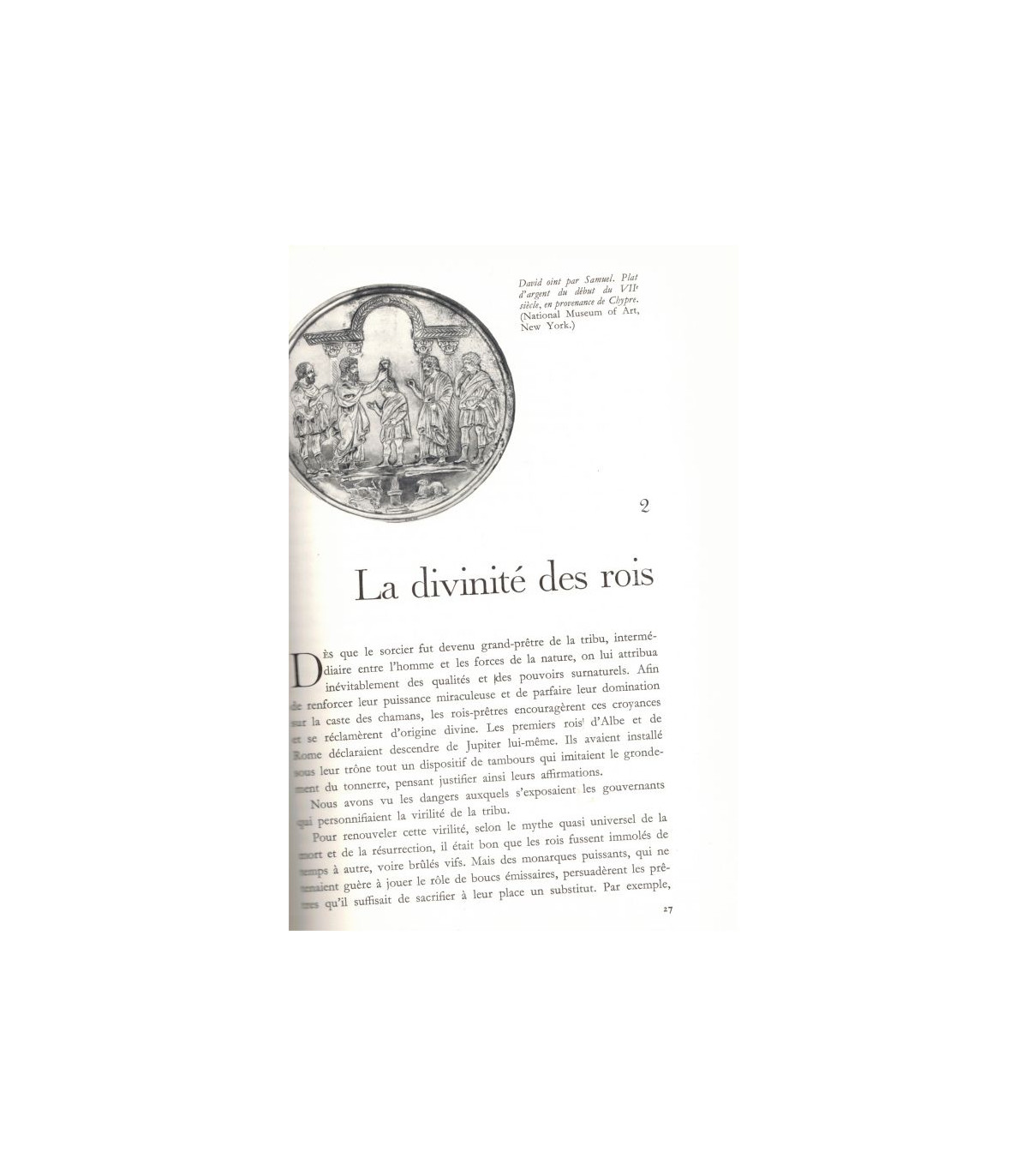 Fondements magiques de la royauté : la société primitive était dominée par la superstition - magie collective - importance de la fécondité - le grand-prêtre et le chef de tribvu - meurtre rituel des rois aztèques - la monarchie dans la Grèce homérique - Babylone et Persépolis - cérémonie de l'huile sainte -