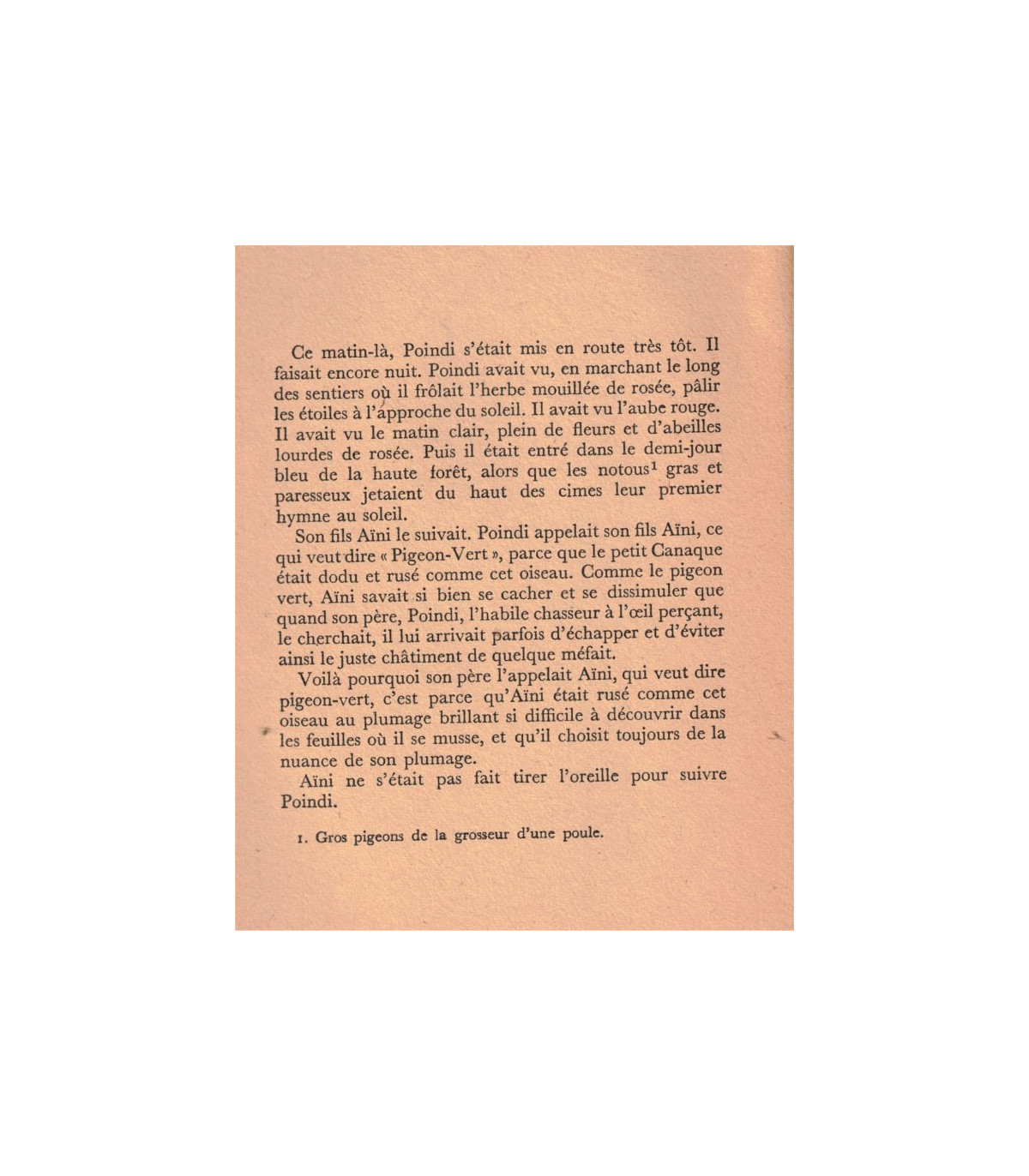 Poindi, le chasseur canaque, marchait dans la forêt avec son fils Aïni. Au-dessus d'eux, la haute cime des arbres formait une voûte si épaisse qu'on ne voyait jamais le bleu du ciel. Rien d'autre que son instinct ne pouvait servir à Poindi pour se guider.