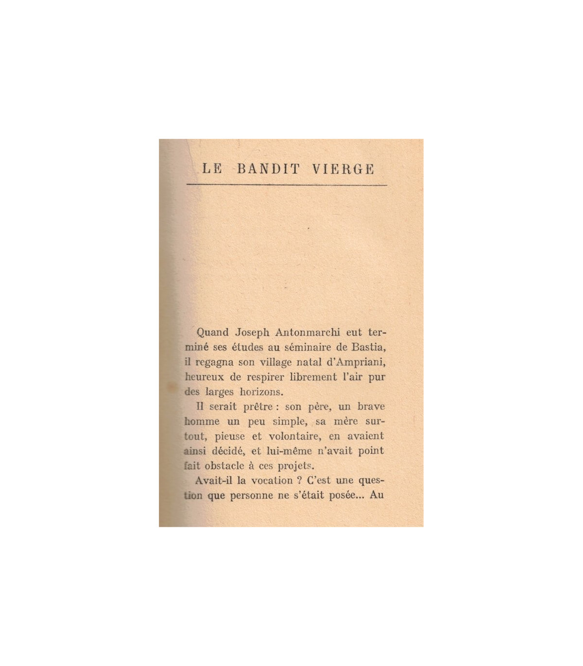 Le bandit vierge, Henri Pierhome - roman - Collection Le Livre d'Aujourd'hui- "Parmi ce ramassis de brigands sanguinaires, éperdus d'orgueil ou de vengeance, et dressés implacablement contre tout ce qui, de près ou de loin, représentait à leurs yeux l'ordre et l'autorité, quelques physionomies se détachent en traits particulièrement accusés et méritent vraiment de retenir l'attention de l'historien. Ainsi, ce visage de Gallochio, de ce séminariste dont nous retraçons ici l'histoire d'après les documents les plus authentiques, les plus précis, les plus officiels, et qui, pareil à ces personnages des drames antiques, semble avoir constamment été le jouet de cette fatalité que les anciens appelaient la terrible Ananké; L'étude de ce caractère attire l'historien et déroute le psychologue : jusqu'au bout, il reste effroyablement énigmatique. Il y a, en ce séminariste, une volonté implacable, une volonté monstrueuse qui ne connaîtra aucun obstacle. Elle se double d'un sens absolu de l'équité, qui implique le respect de la parole donnée, de l'engagement pris, du serment proféré, respect tellement scrupuleux que la mort seule peut en châtier la défaillance.