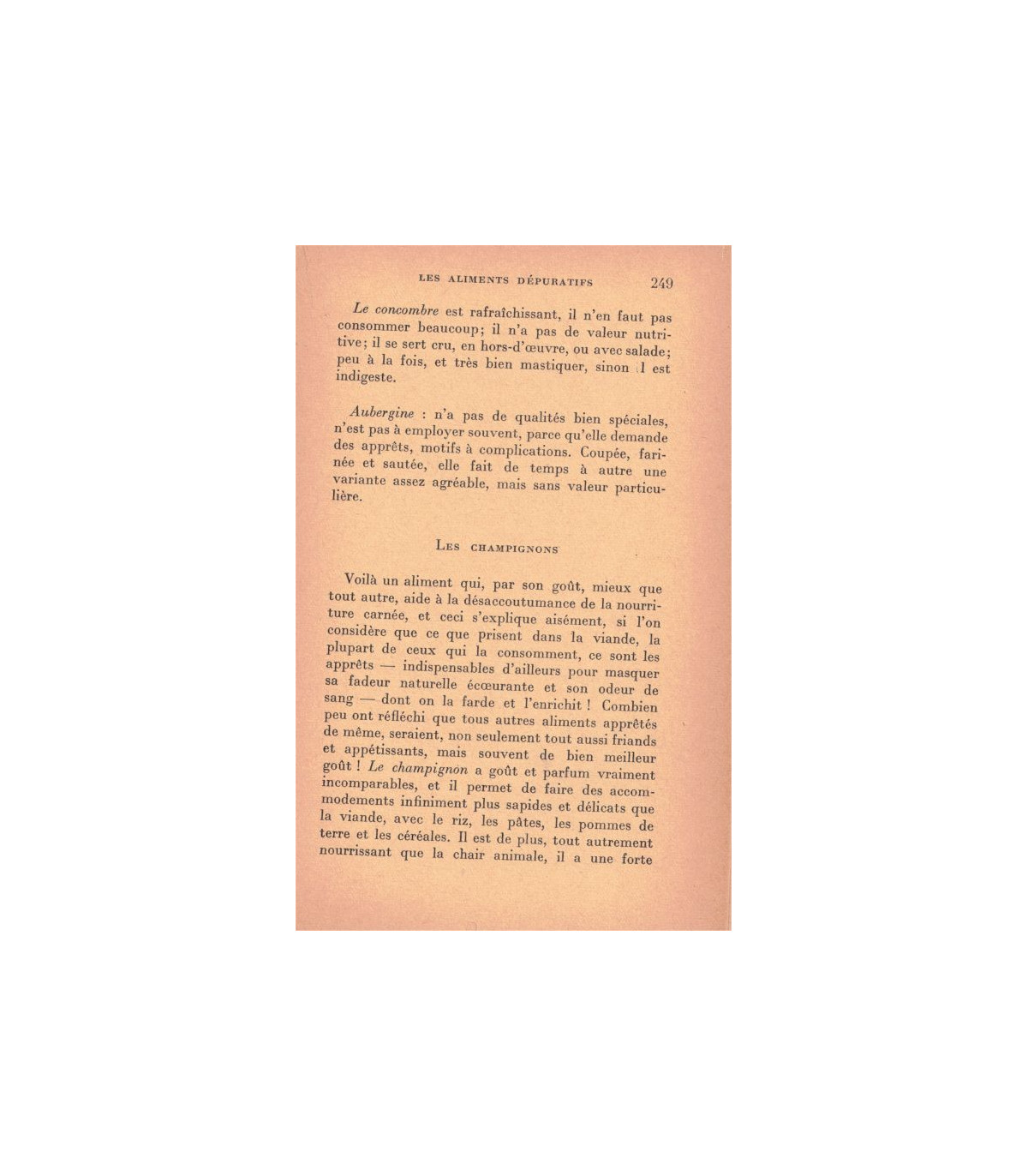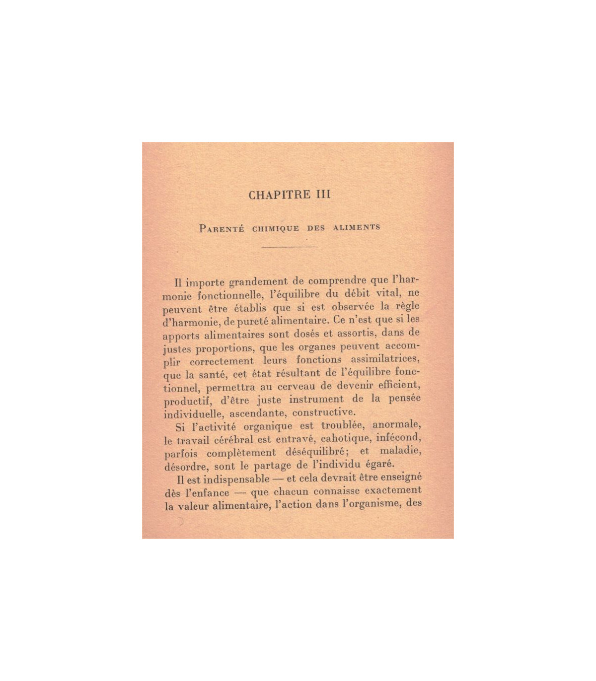 But et action de la nourriture : nourriture et intelligence - pureté de la nourriture - parenté chimique des aliments - l'assortiment des mets - aliments crus et cuits - les saisons et les heures - la digestion - la suralimentation - la fermentation -