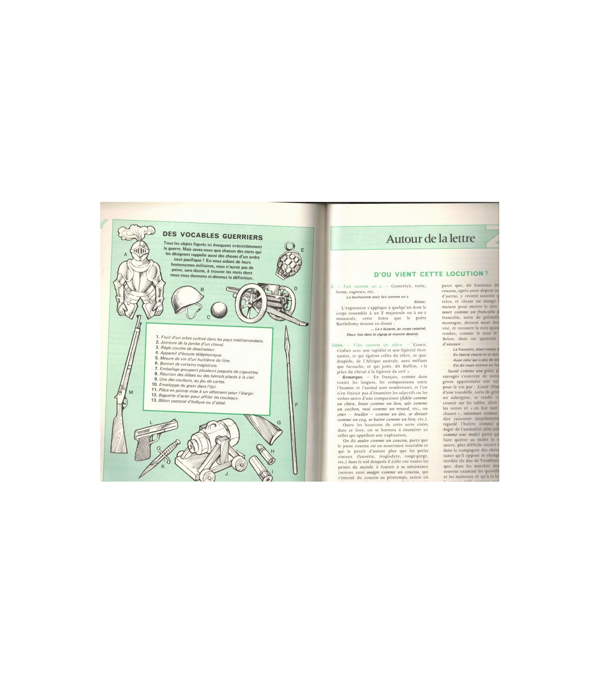 Ce que vous devez savoir de A à Z - d'où vient cette locution - préfixes et suffixes - quelle est la définition juste - dites ceci, ne dites pas cela - votre quart d'heure de lecture - attention à la prononciation - un peu de grammaire - homonymes - jouons en famille - des dessins et des mots - exerçons-nous - le lièvre et le langage - une lette de Madame de Sévigné - petit jeu étymologique - vocabulaire de l'audio-visuel -