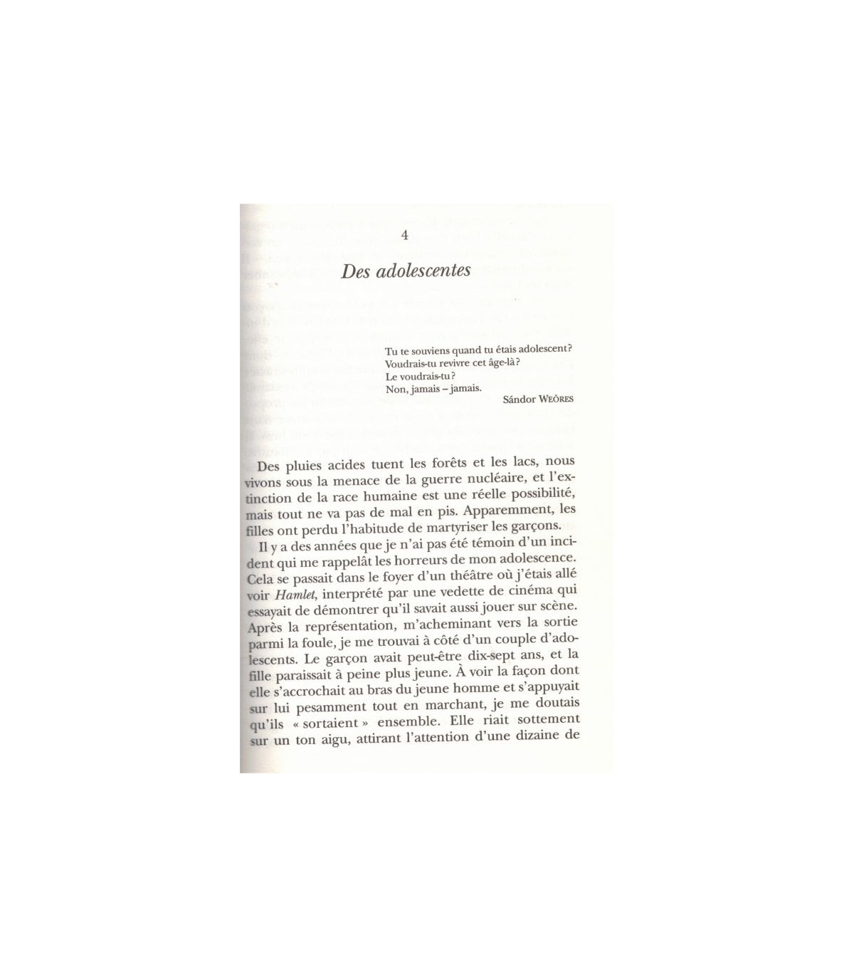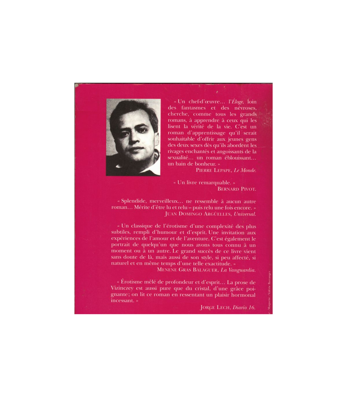 "Contexte érotique, jeux, frustrations, erreurs naïves, humiliations, gaieté et larmes du plaisir.. Vizinczey n'exagère jamais, il écrit avec un détachement qui ne manque pas d'ironie ; son style gracieux et évocateur nous libère de l'angoisse qui accompagne si souvent l'amour. Un petit chef-d'œuvre où le sexe et à la fois savoir et bonne littérature.