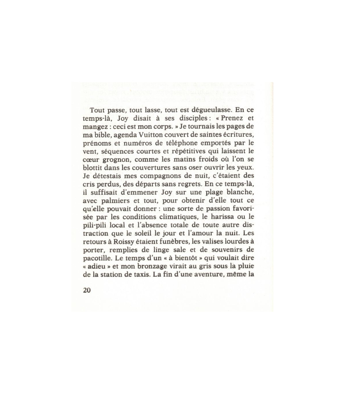 Je n'ai jamais rien compris aux hommes. J'ai tout mélangé, comme une leçon mal apprise, sans réfléchir, sans faire attention, j'ai tout raté, tout gâté, tout gâché. J'étais boute-ent-train, Pierrot Gourmand, Superowoman, Juliette, la première, la préférée, celle qui réussit tout, la perle de feu dans l'eau froide, insensible aux douleurs provoquées par les amours contondantes, massacreuse impitoyable et sucrée des démons de midi pathétiques ou pervers, belle et conne à n'en plus pouvoir, moi d'abord, mais heureuse; vide et heureuse.