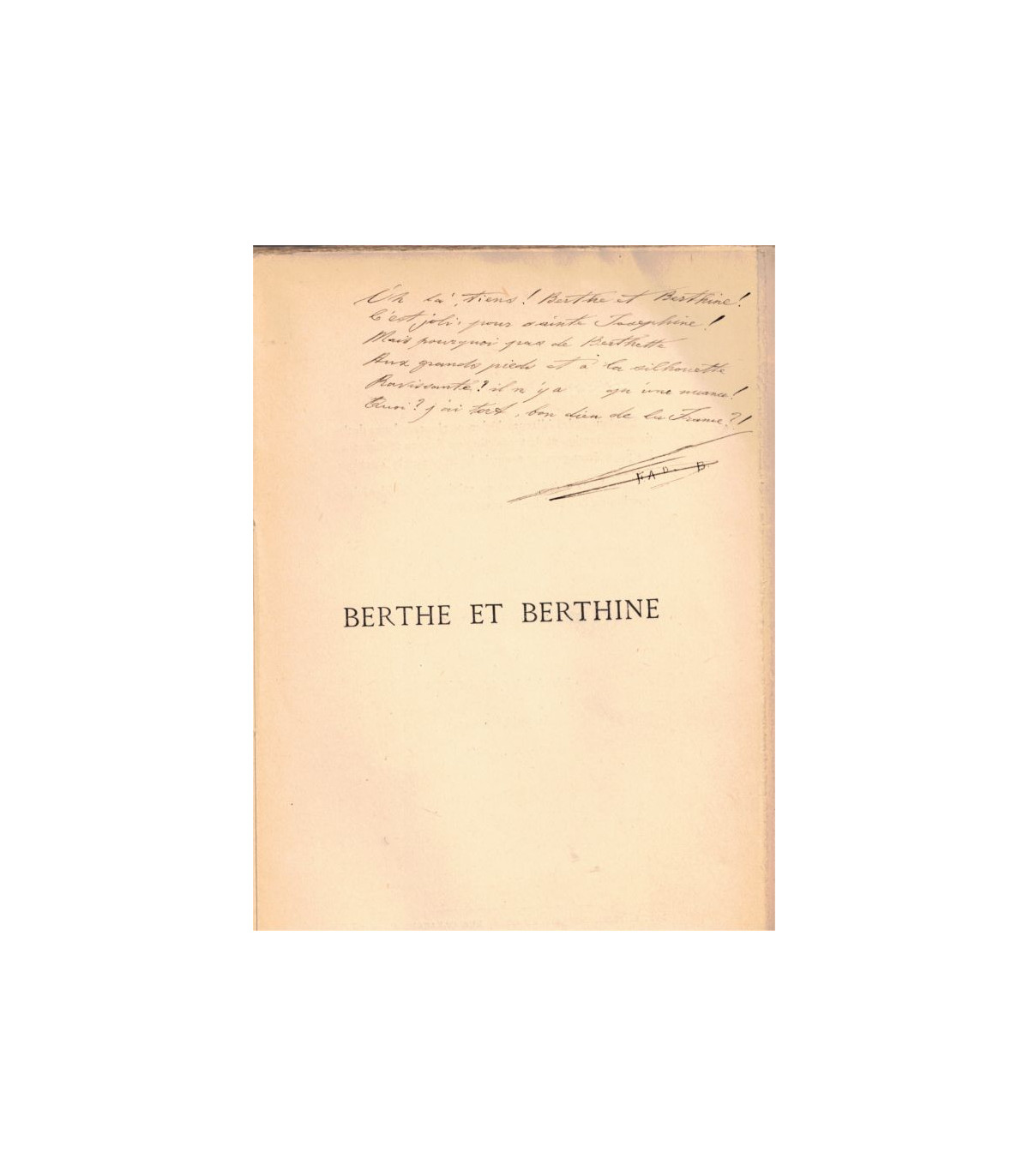 Berthe et Berthine, Georges Mareschal de Bièvre - dédicace en page de garde, d'une écriture fine avec en signature F a B "Oh là! Tiens! Berthe et Berthine ! C'est joli pour sainte Joséphine ! Mais pourquoi pas de Berthette Aux Grands Pieds et à la silhouette ravissante ? Il n'y a qu'une nuance ! Quoi ? J'ai tord, bon dieu de la France ?!" Est-ce la signature de l'auteur ?