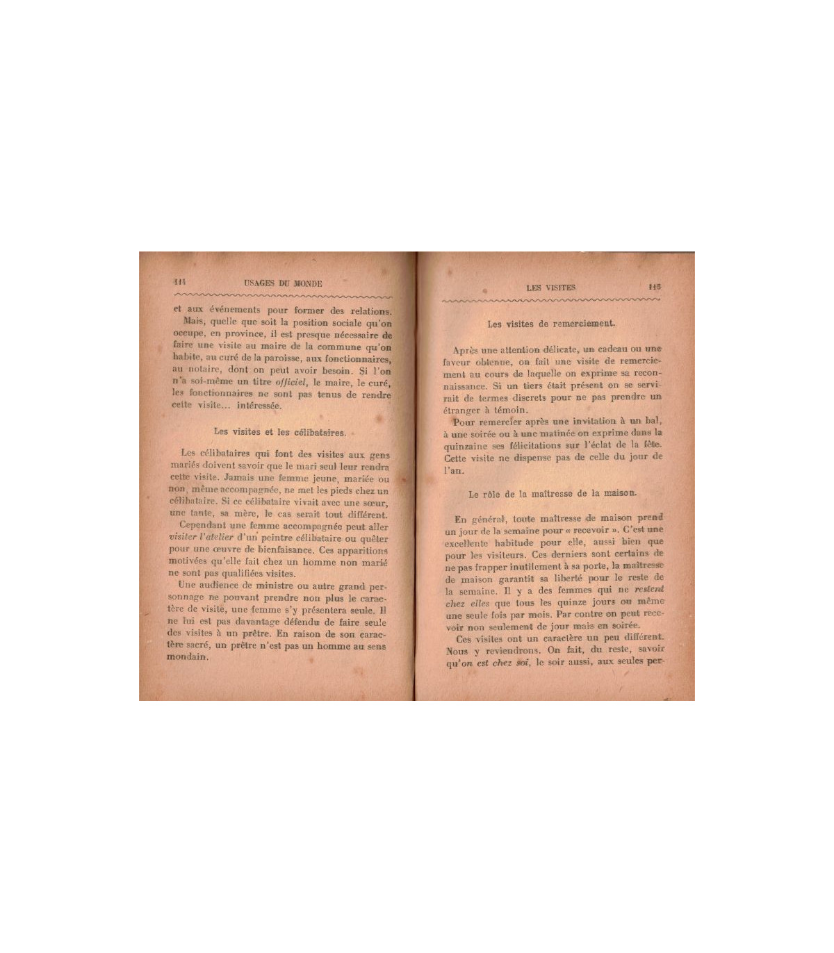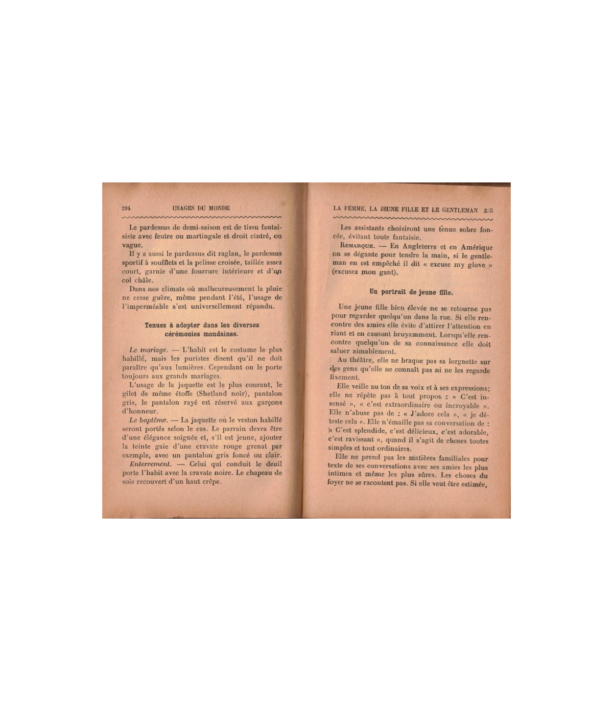 naissance - le baptême - la première communion - rapports avec les professeurs - le mariage - les visites - la conversation - les dîners - bals et soirées - rapports avec les serviteurs - la correspondance - les présents - la jeune femme, la jeune fille et le gentleman - lettres de faire-part et d'invitations - funérailles - le deuil - l'hospitalité - en voyage - sports - divers -