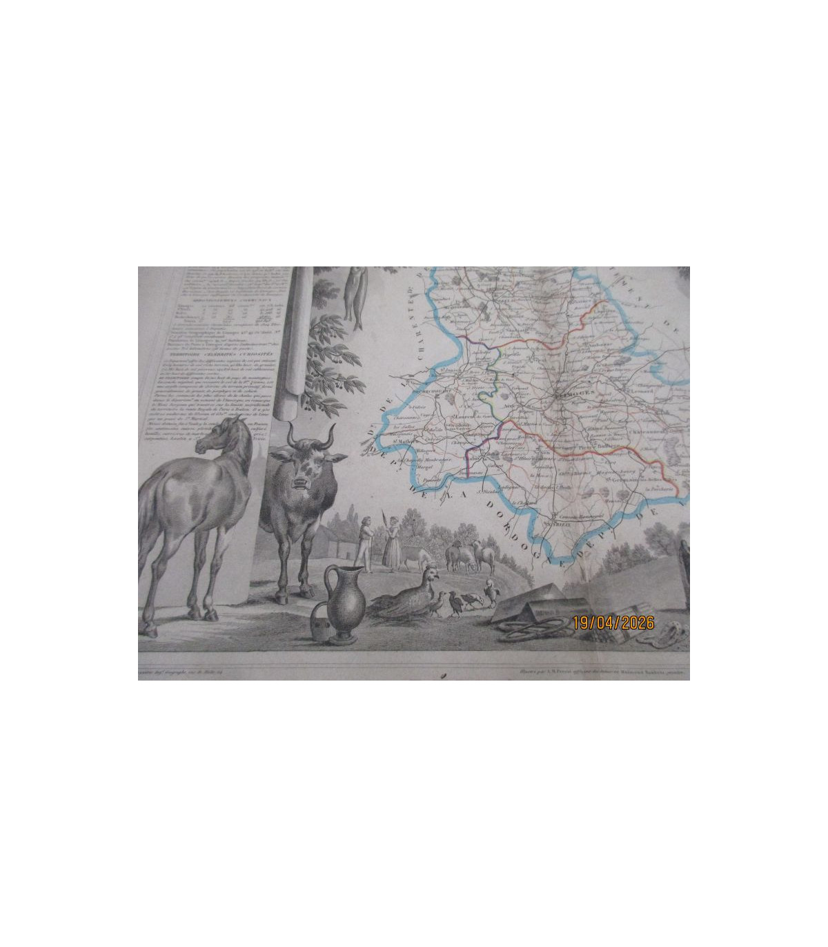 Gravure XIXe siècle, Département de la Haute Vienne - Atlas National Illustré, Région Sud-Est n. 84 - Géographie et Statistique par Victor Levasseur, Ingénieur géographe, rue de Malte, 24 - illustré par A.M. Perrot, officier du Génie, et Raimond Bonheur, peintre. Gravé par Laguillermie et Rainaud, rue St. Jacques, N°82 -