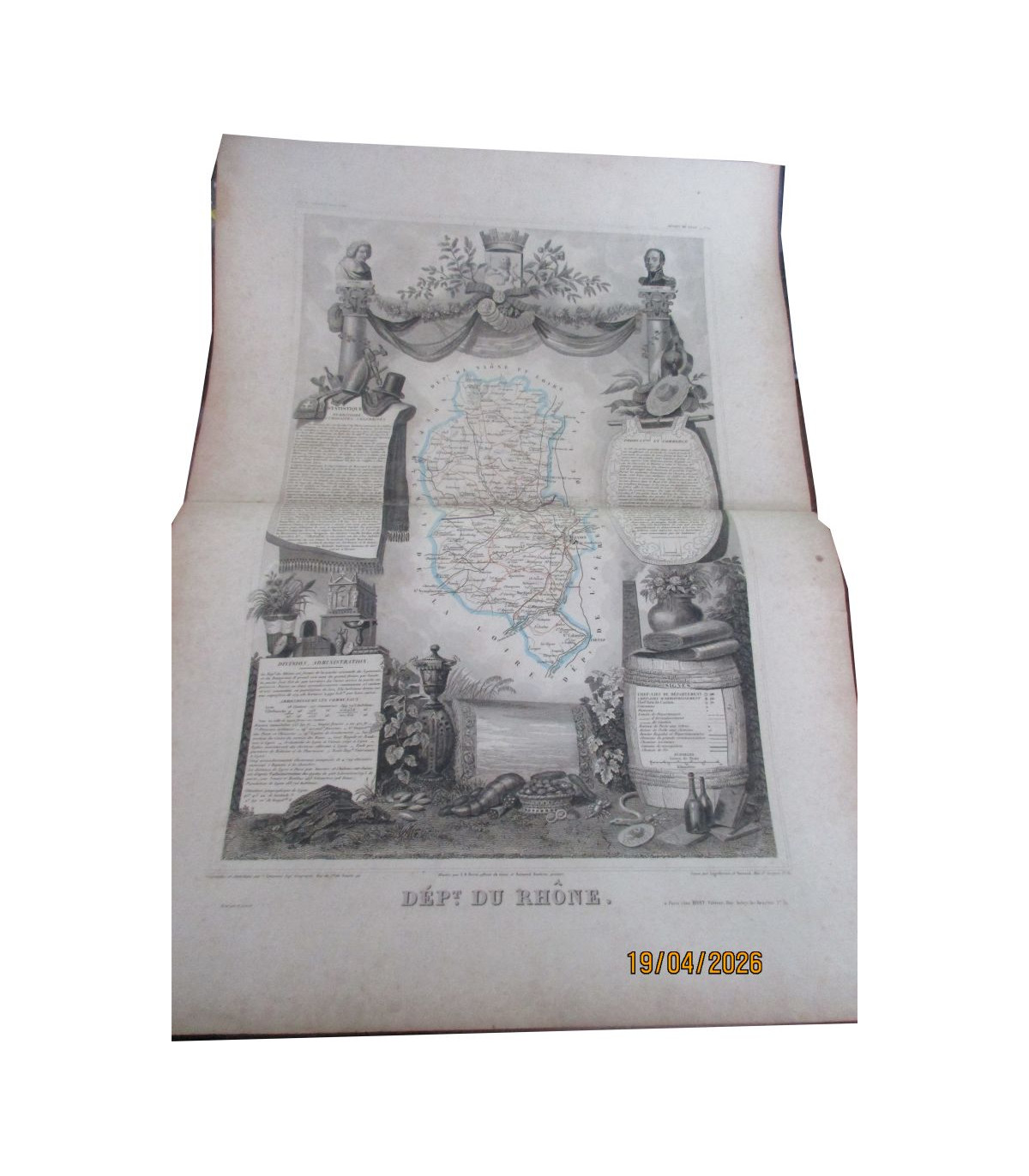 Gravure XIXe siècle, Département du Rhône - Atlas National Illustré, Région de l'Est n 68 - Géographie et Statistique par Victor Levasseur, Ingénieur géographe, rue du Faubourg du Temple 46 - illustré par A.M. Perrot, officier du Génie, et Raimond Bonheur, peintre. Gravé par Laguillermie et Rainaud, rue St. Jacques n°82 - Rare ! car fait partie des premières éditions de l'Atlas de Levasseur, antérieures à Combette, par l'éditeur Binet 34 rue Aubry-le-Boucher, entre 1842 et 1844.