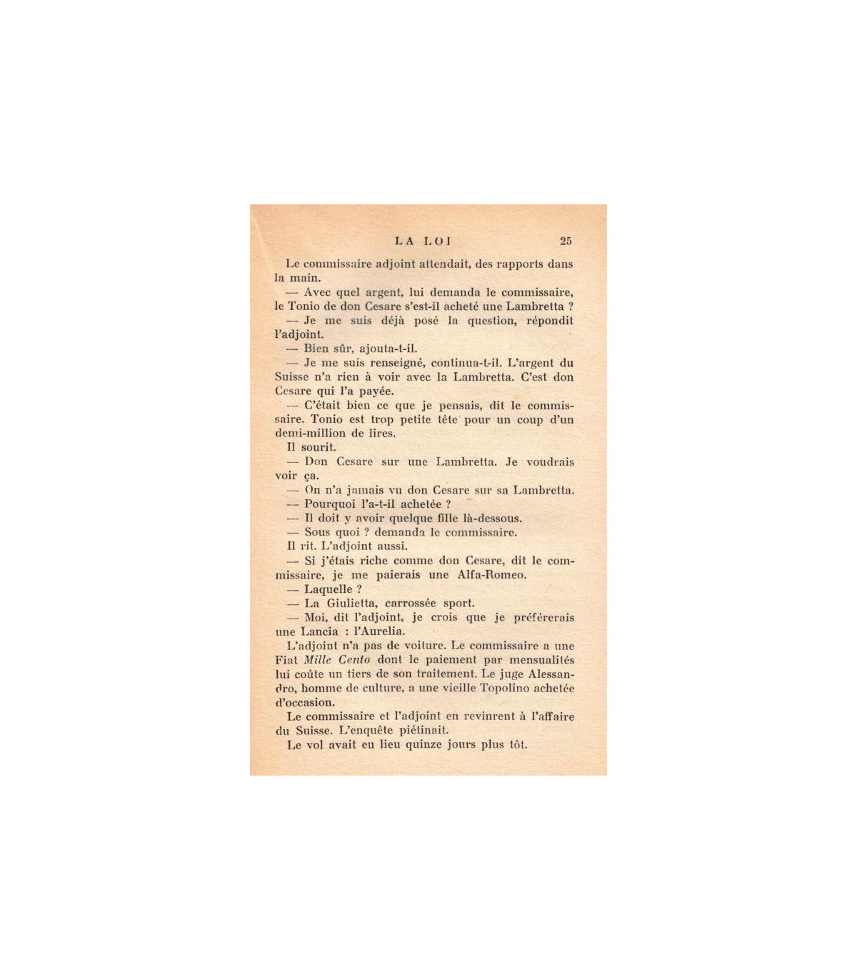 La Loi est un jeu qui se pratique avec passion dans toutes les tavernes du Sud de l'Italie. Les tarots ou les dés ayant désigné un "patron" et un "sous-patron", les autres joueurs doivent se plier à toutes les brimades tant que la cruche de vin achetée avec les mises des perdants n'est pas vide. Les deux gagnants "ont le droit de dire et de ne pas dire, d'interroger et de répondre à la place de l'interrogé, de louer et de blâmer, d'injurier, d'insinuer, de médire, de calomnier et de porter atteinte ; les perdants, qui subissent la loi, ont le devoir de subir dans le silence et l'immobilité. Telle est la rège fondamentale du jeu de la Loi.