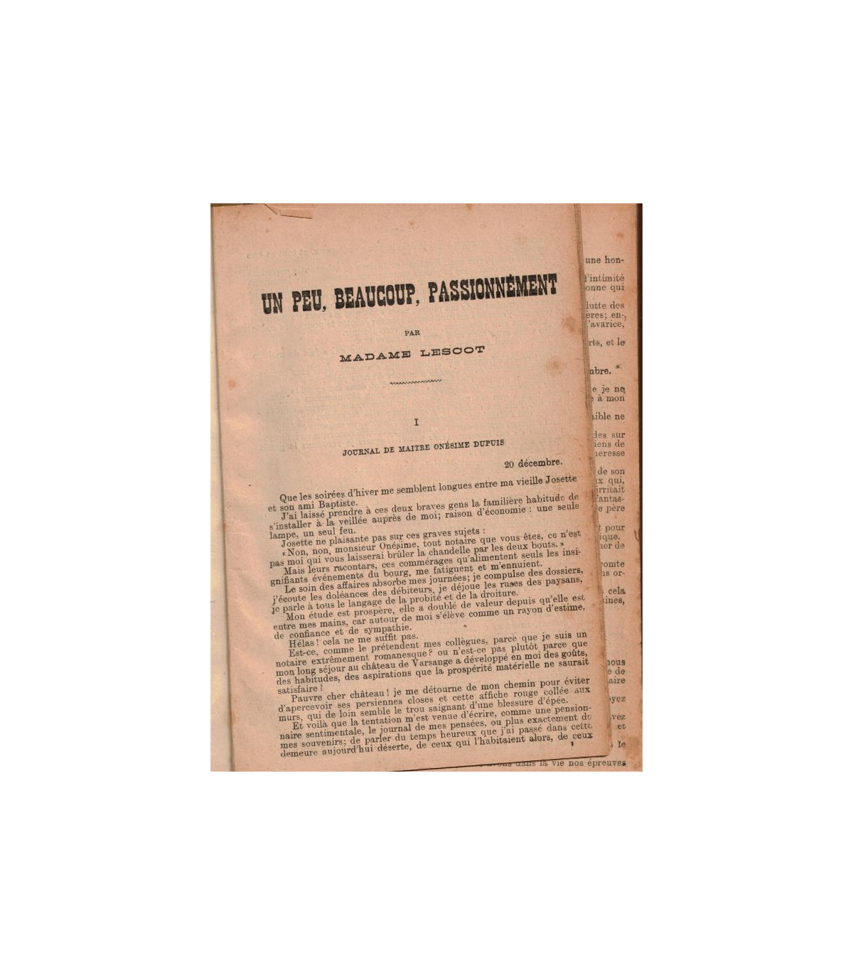 Un peu, beaucoup, passionnément, par Madame Lescot : Que les soirées d'hiver me semblent longues entre ma vieille Josette et son ami Baptiste. J'ai laissé prendre à ces deux braves gens la familière habitude de s'installer à la veillée auprès de moi; raison d'éconimie: une seule lampe, un seul feu.