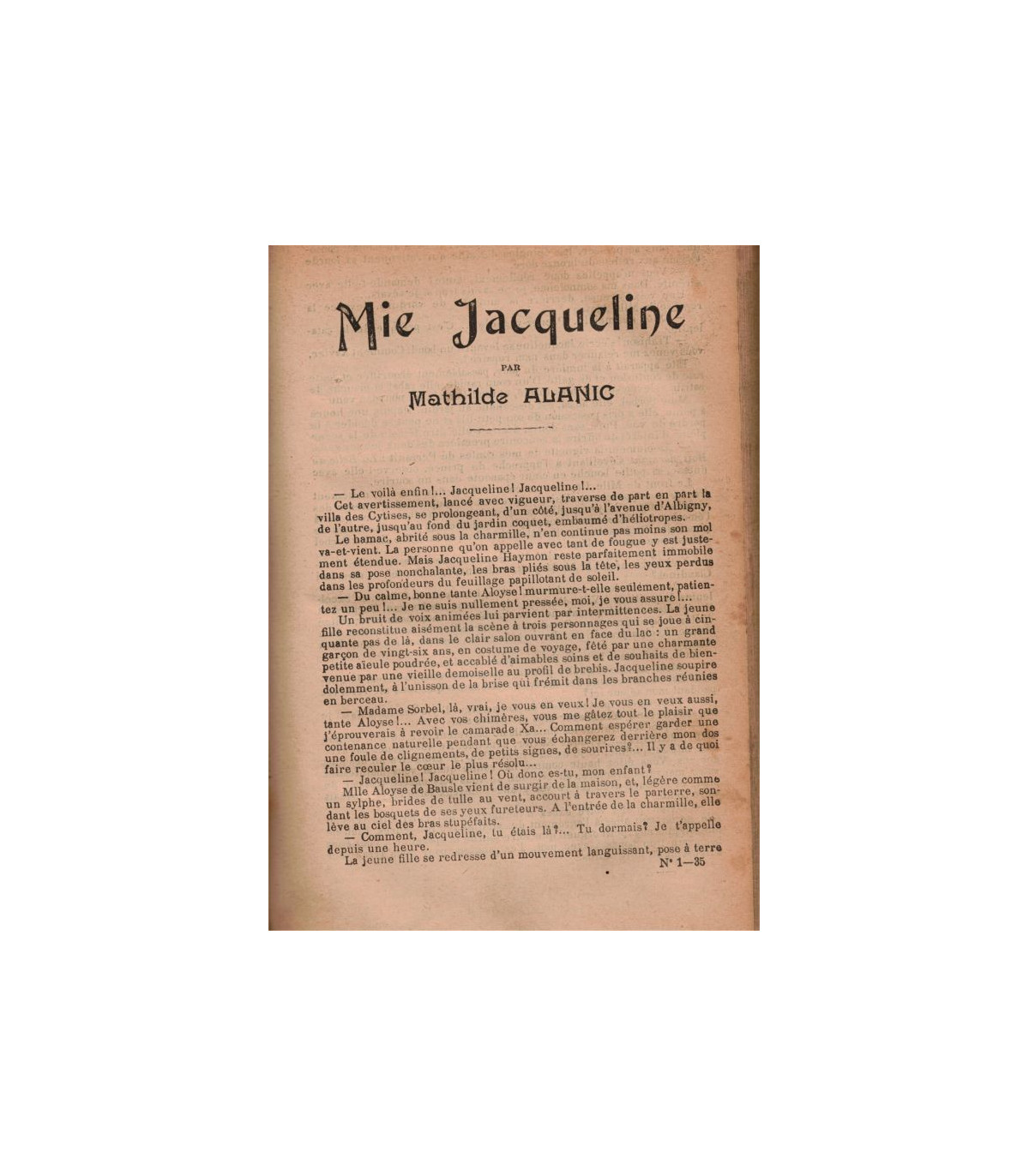 Mie Jacqueline, par Mathilde Alanic, roman de 1902 (1864–1948) : jeune fille moderne, indépendante, au caractère capricieux, ne veut pas, par esprit de contradiction, accepter comme fiancé l'ami de sa jeunesse, Xavier Saurel, jeune savant qui l'adore et dont l'union avec elle ferait la joie de ses parents. Elle rêve, et sous le pseudonyme de Mérette, répond dans un journal au beau Boris, talentueux écrivain, bellâtre insipide, habile jongleur de mots au coeur froid et peureux, et de qui elle parvient à faire la connaissance sans qu'il soupçonne son identité.