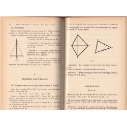 III. Géométrie - révision : droite, cercle, angle, polygones, symétrie - cas d'égalité des triangles, triangle isocèle - les deux premiers cas d'égalité, triangle isocèle, triangle équilatéral, médiatrice d'un segment, troisième cas d'égalité - triangles rectangles, cas d'égalité, propriétés de la bissectrice d'un angle - relations d'inégalité : angles et côtés d'un triangle, relations entre les côtés d'un triangle, perpendiculaires et obliques, régions séparées par la médiatrice d'un segment - parallèles, axiome d'Euclide, propriétés angulaires, angles à côtés parallèles - somme des angles d'un polygone - parallélogrammes, réciproques, contre de symétrie d'un parallélogramme - parallélogrammes particuliers : rectangle, losange, carré - parallèles équidistantes, trapèze - droites concourantes dans le triangle - Problèmes de révision - cercle et droite, détermination d'un cercle, positions relatives d'un cercle et d'une droite - positions relatives de deux cercles, points communs à deux cercles, positions relatives de deux cercles inégaux - cordes, cordes et arcs, cordes et diamètres, distances des cordes au centre - angles et arcs, angle au centre, angle inscrit, arc capable d'un angle donné, quadrilatère inscriptible - constructions, constructions élémentaires, triangles, tangentes - Avec exercices - problèmes de révision - résolution de problèmes. Avec le tampon "spécimen" sur le plat de couverture et la page de titre, car offert par l'éditeur à l'enseignent.