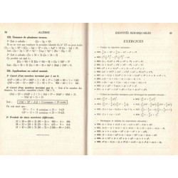 Arithmétique et algèbre : puissances - nombres premiers - plus grand commun diviseur, plus petit commun multiple - applications aux fractions - nombres algébriques ou relatifs - addition des nombres relatifs - soustraction des nombres relatifs - produit des nombres relatifs - division des nombres relatifs - relation de Chasles - puissances - inégalités - expressions algébriques - monômes - polynômes - multiplication des polynômes - identités remarquables - division des monômes et des polynômes - décomposition en facteurs - fractions rationnelles - équation du premier degré - équations se ramenant au premier degré - systèmes d'équations - problèmes d'algèbre - exercices de révision -