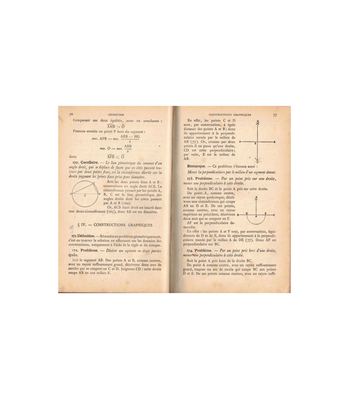 Géométrie plane : triangles, perpendiculaires et obliques, parallèles, parallélogrammes - cordes, arcs, angles au centre, tangentes ; poisitons relatives des deux circonférences ; mesure des angles, constructions graphiques - Surfaces, segments proportionnels, triangles et polygones semblables, relations métriques dans le triangle, segments proportionnels dans le cercle, problèmes sur les segments proportionnels - polygones réguliers, mesure de circonférence -