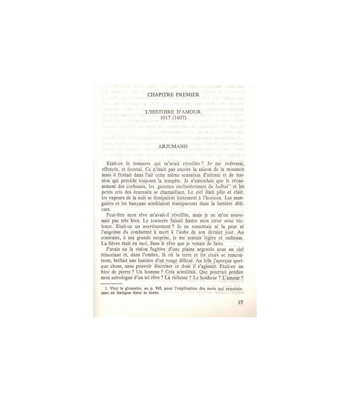 Pour Arjumand Banu, issue d'une famille noble, et Shah Jahan, prince héritier, les destins vont s'entrecroiser tissant une histoire véridique plus romanesque que les romans, et qui est par-dessus tout une extraordinaire histoire d'amour.